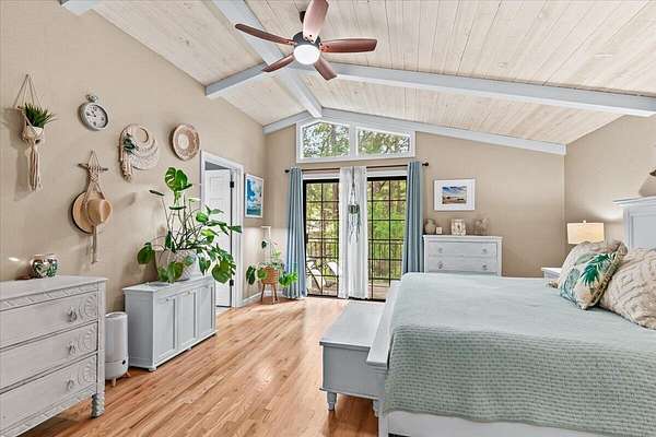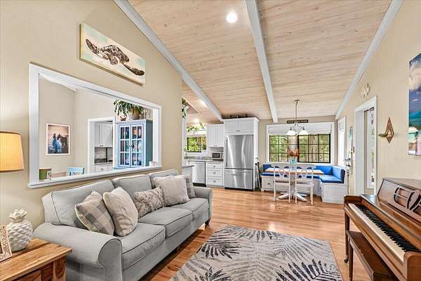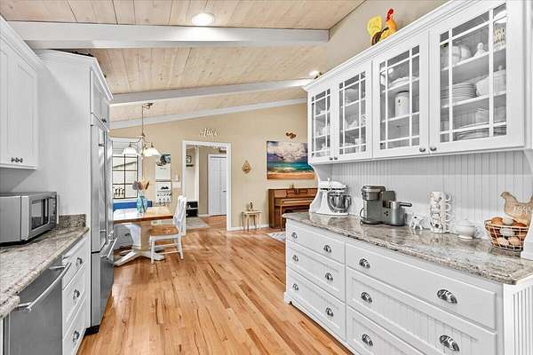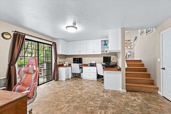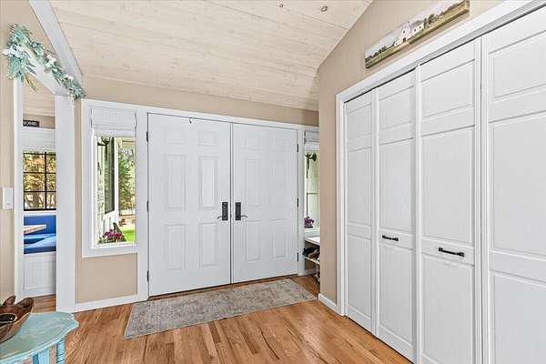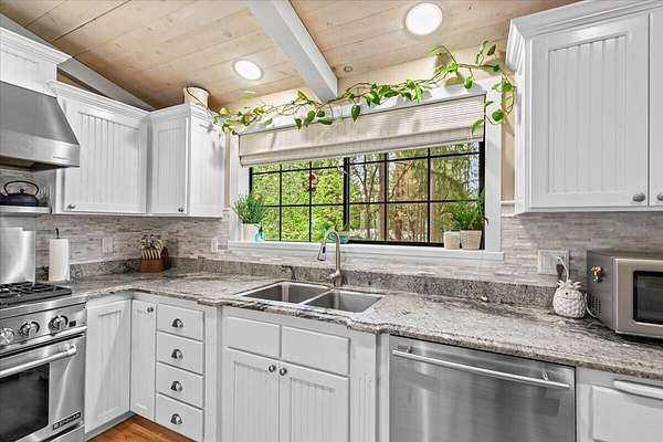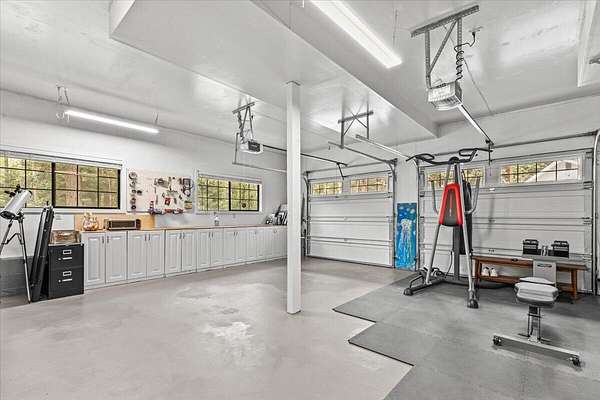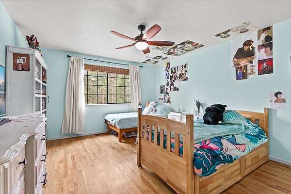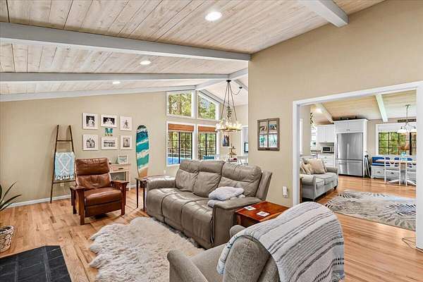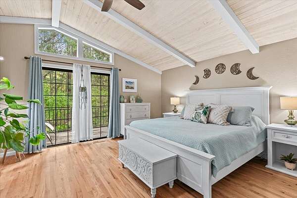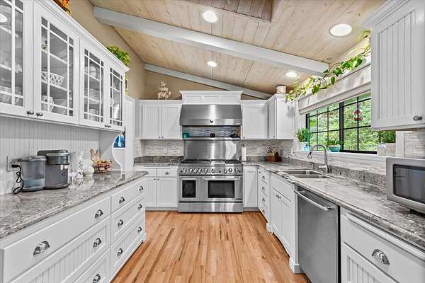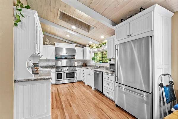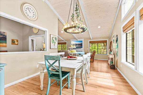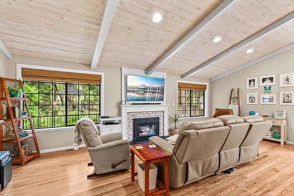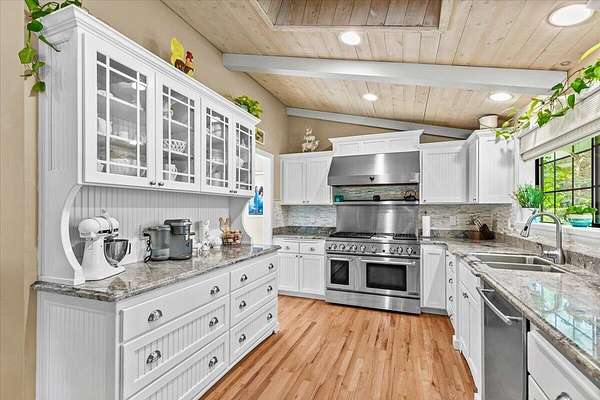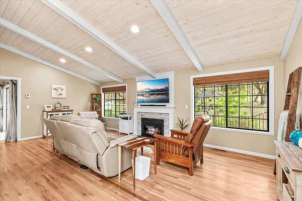 Beautiful, modern home with large, fully finished shop (w/220v) on 2.5 usable acres. This property features an automatic gate, graveled RV parking w/hookup (20,30,50 amp), recently built barn, swimming pool with deck surround, & outbuilding. Immaculate home features 3 bedrooms, 2.5 bathrooms, separate family & living rooms, hardwood floors and tile throughout, vaulted open-beam ceilings & gas fireplace. Chef's kitchen offers a 6-burner stainless gas range w/double ovens & hood, granite counters, tile backsplash, breakfast nook, ample cabinet space, and stainless Jenn Air appliances. Spacious primary suite has a vaulted ceiling, private balcony, attached bathroom with dual sinks, great counter space, soaking tub and shower. Large laundry room has a utility sink, cabinetry, and half bath. Landscaped backyard with gazebo, greenhouse, lovely pond, raised-bed garden & fruit trees. Attached 2 car garage plus bonus area great for extra storage. Top-quality finishes & pride of ownership.
