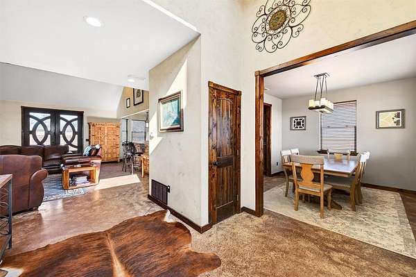 The exterior showcases a wraparound covered porch with stone columns, metal accents, and durable siding--perfect for enjoying wide-open views of the surrounding countryside. Inside, the main living areas feature stained concrete floors, an open-concept layout, and abundant natural light.