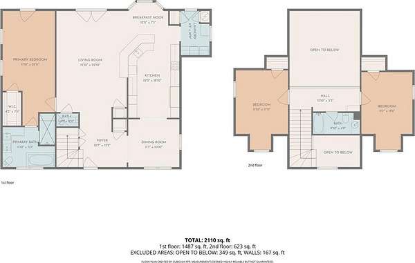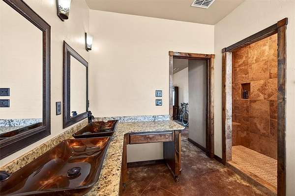 The primary bedroom is located on the first floor and includes a spacious ensuite bath with dual vessel sinks, granite counters, a tiled walk-in shower, and a soaking tub. Additional bedrooms are located upstairs, connected by a loft-style landing that overlooks the main living area.