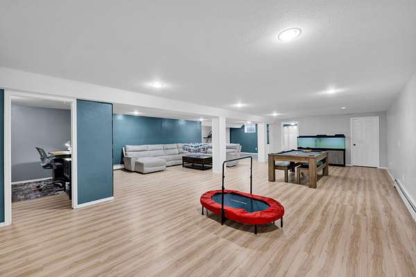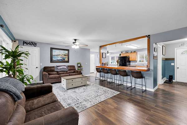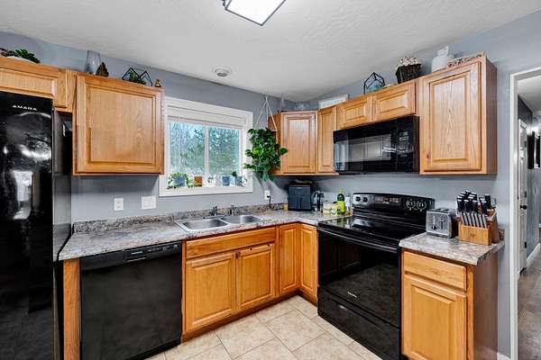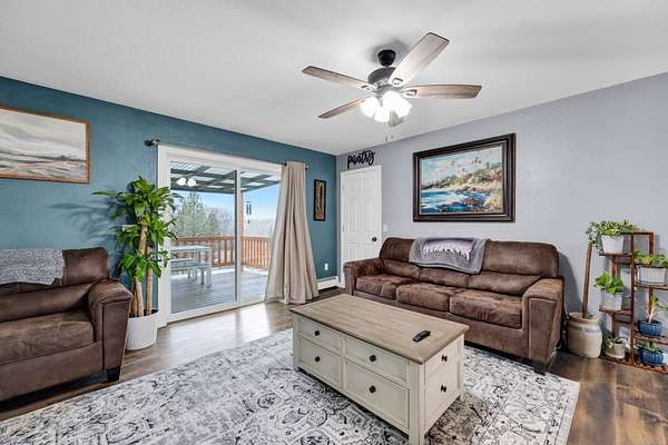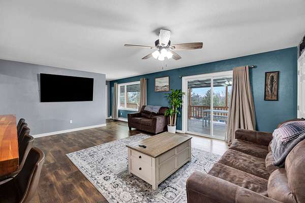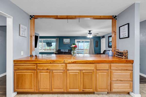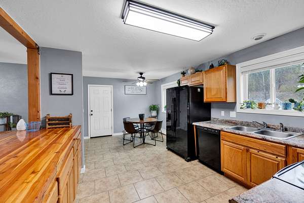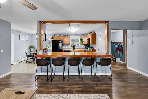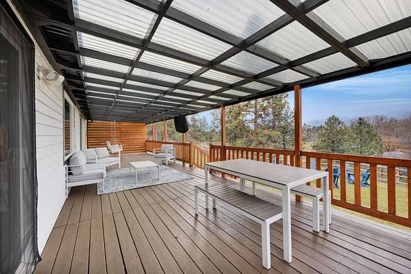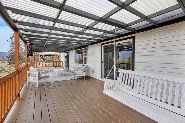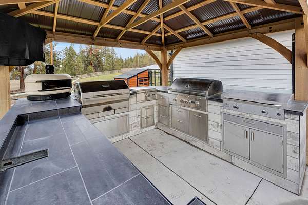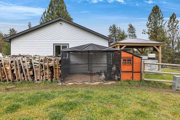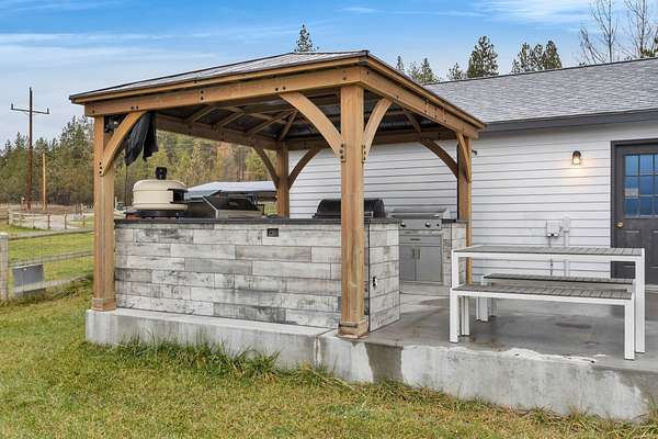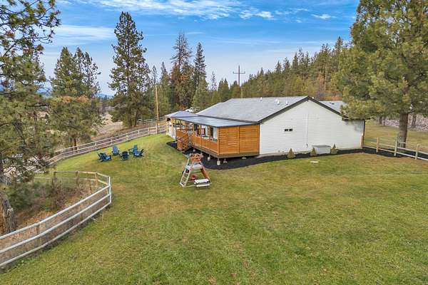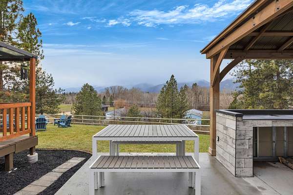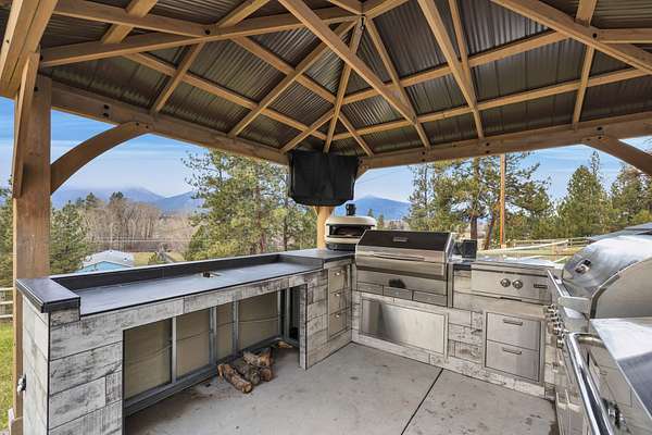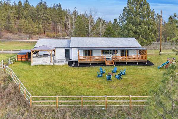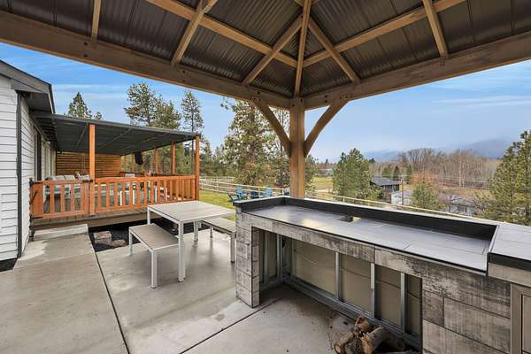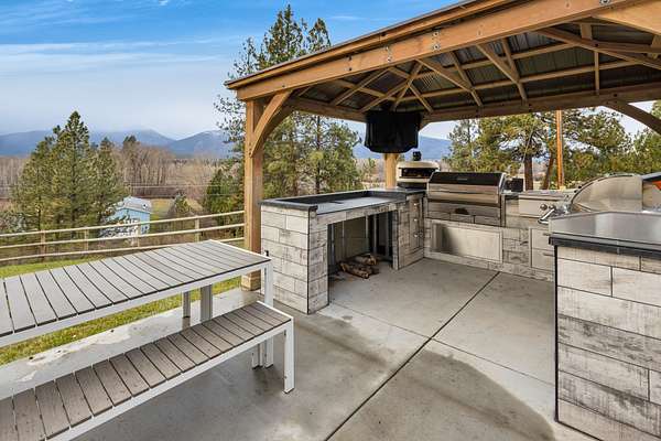 This Stevensville home offers over 3,000 square feet of well-designed living space, with a functional main-level layout and a fully finished lower level ideal for flexible use. The main floor includes three bedrooms and two bathrooms, providing comfortable everyday living. The lower level expands the home's versatility with a large open entertaining area, a wet bar, an office or bonus room, an additional full bathroom, and a dedicated storage room, perfect for recreation, media space, guests, or multi-purpose living. Outdoor amenities are equally impressive, featuring a covered outdoor kitchen with built-in grills, a spacious covered back patio, a fire pit area, a chicken coop, and a fully fenced yard with underground sprinklers and established landscaping. Additional highlights include an attached two-car garage, RV parking, and a 40-foot Conex container with solar power, offering exceptional storage or workshop space. Enjoy peaceful views of the Bitterroot Mountains from the backyard, all while being conveniently located near Stevensville amenities, local parks, and Highway 93, combining space, functionality, and the Montana lifestyle.