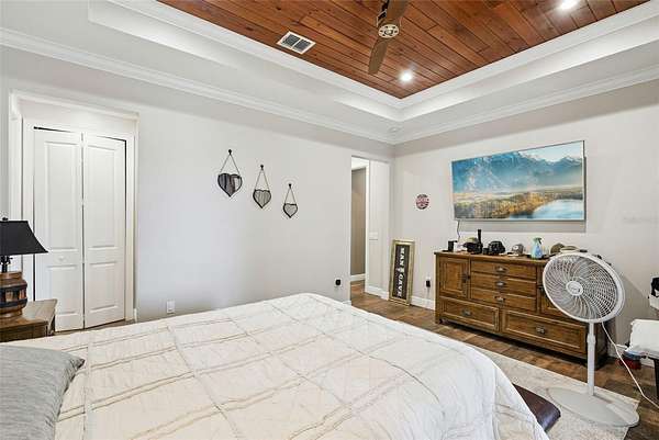 Welcome to this beautifully maintained 2017 custom home offering the perfect balance of modern comfort and peaceful country living on 10 fully usable acres. This thoughtfully designed 3-bedroom, 2-bath residence features an open floor plan with wood-plank tile throughout, a spacious kitchen with solid wood cabinetry, crown molding, granite countertops, stainless steel appliances, and a large island ideal for entertaining. The primary suite includes a tray ceiling, walk-in closet, and private bath, while all bedrooms feature built-in closets.