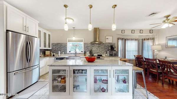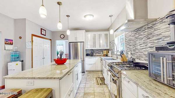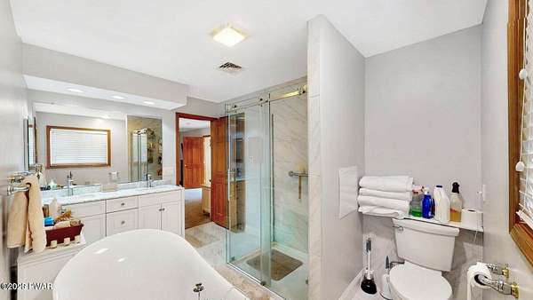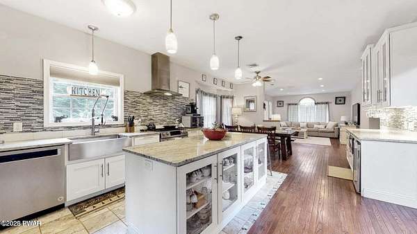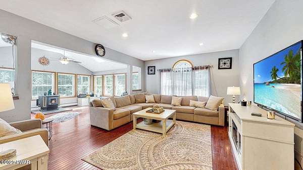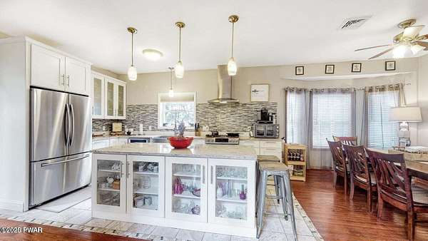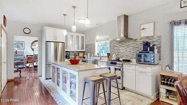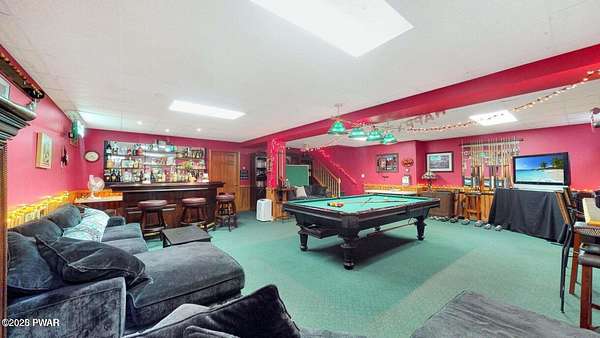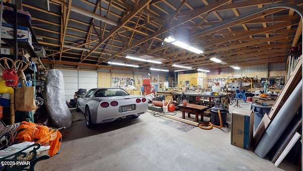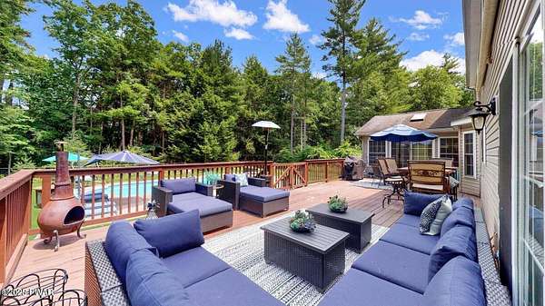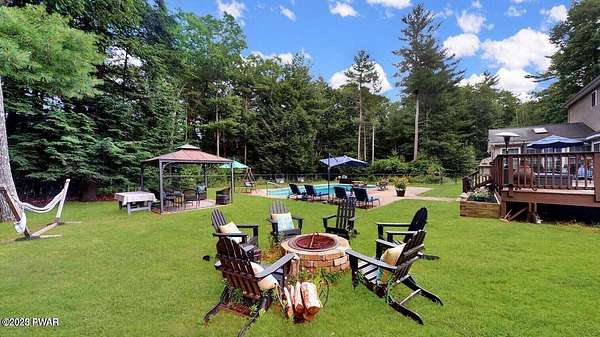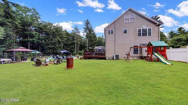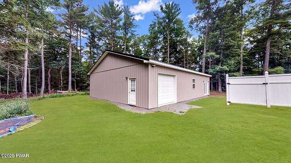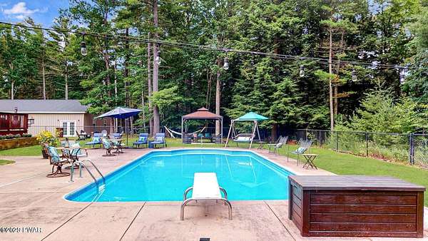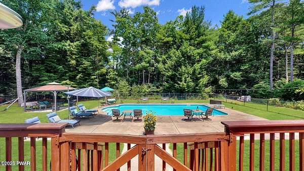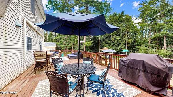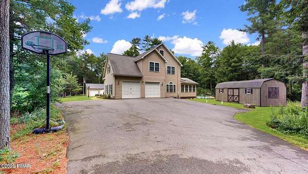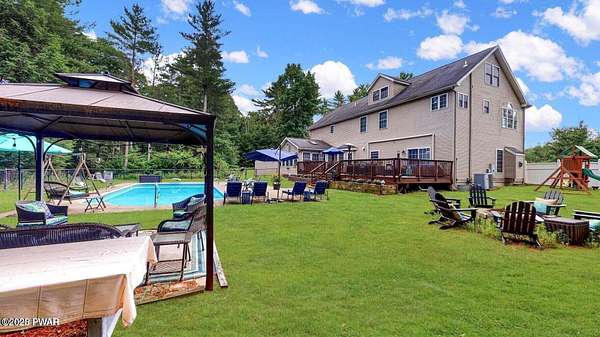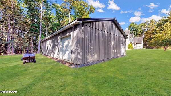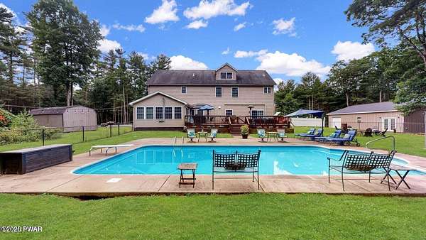 STATELY, CUSTOM-BUILT COLONIAL ON FULLY FINISHED BASEMENT w/ 3RD FLOOR IN-LAW SUITE, 2-CAR GARAGE, WHOLE HOUSE GENERATOR, COVERED FRONT PATIO, FULLY FENCED-IN BACKYARD w/ LARGE BACK DECK OVERLOOKING ITS BEAUTIFUL INGROUND POOL w/ BRAND NEW LINER & POOL COVER, HUGE 48'x38' HEATED POLE BARN/WORKSHOP w/ GARAGE BAY & NICE STORAGE SHED, ALL PRIVATELY SET ON 2.93 ACRES BACKING TO SAWKILL CREEK. Located in the heart of the Poconos & just a stone's throw from historic Milford, PA, this magnificent, fully updated & upgraded 5 BR 3.5 Bath Pocono Dream Home boasts propane hot water baseboard heating, brand new multizone central AC & water filtration system, high ceilings, large windows & beautiful cherry hardwood floors throughout. The 1st floor features a welcoming living room w/ high ceilings & stone propane fireplace opening to a formal dining room w/ tray ceiling leading to a gorgeous ultra-modern kitchen w/ granite countertops, top-of-the-line stainless steel appliances, custom cabinetry, large center island, coffee bar & off-kitchen dining area w/ sliders to the back deck & huge extended family room w/ cozy pellet stove. The 2nd floor boasts 4 spacious BRs including a large master suite w/ French door entry, barn-door walk-in closet plus additional walk-in & an ultra-modern ensuite w/ beautiful ceramic tile, floor-to-ceiling glass shower, freestanding soaking tub & his & her sinks. One BR includes a connected office/sitting area plus a full main bath. The 3rd floor is a full-size finished attic converted into its own 1-BR apartment w/ kitchen, living & dining areas & full bath--ideal for guests or extended family. The finished basement completes the home w/ extra living & storage space, including a bar area, pool table, TV & sitting area--perfect for hangouts, parties & large gatherings. DV SCHOOL DISTRICT; MINUTES FROM I-84 & BRIDGES FOR QUICK COMMUTE TO NJ & NY.