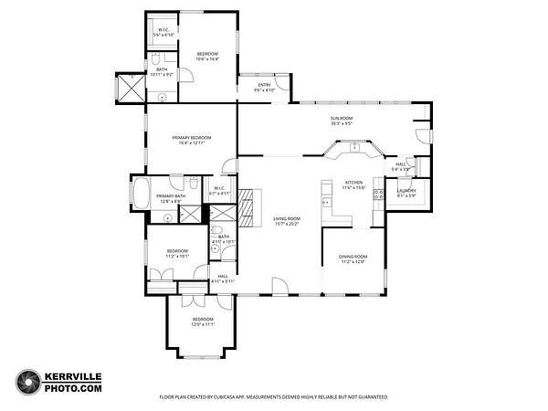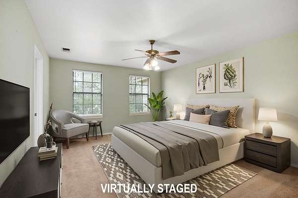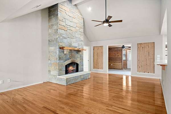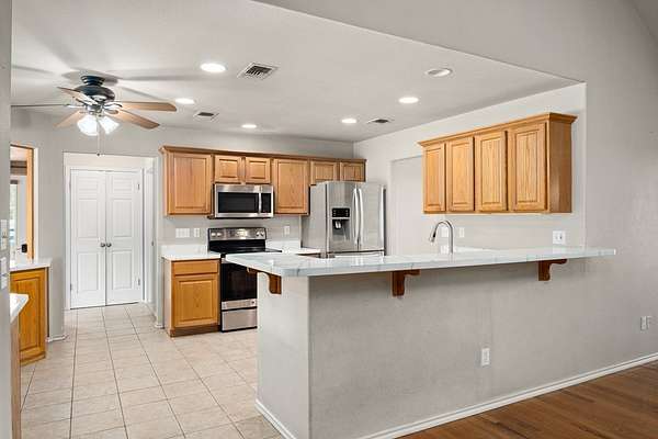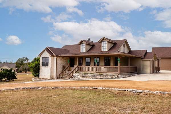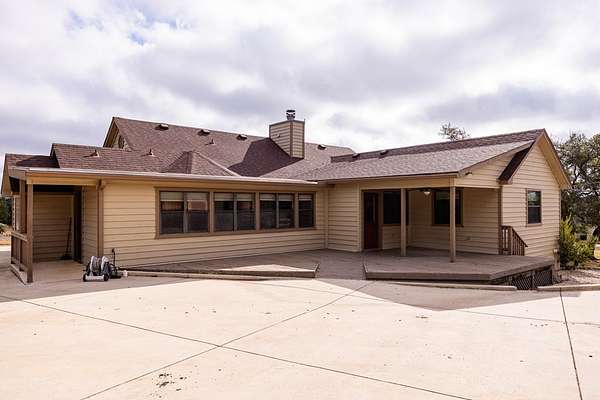 Well maintained 4-bedroom, 3-bath single-level home on 1.85 acres in desirable Highlands Ranch, featuring two private primary suites-one designed for wheelchair accessibility with exterior access and a private deck-perfect for multigenerational living. The spacious living room offers hardwood floors, a rock fireplace, and a cathedral ceiling, flowing into a large kitchen with bar seating, formal dining, and a versatile sunroom. Enjoy mature oak trees, a rock patio for outdoor entertaining, and exceptional storage with a detached oversized 2-car garage plus 30 ft RV bay currently used as a "man cave" with cable, fridge, and extra lighting. Located outside city limits on 2 lots, with lower taxes, this property offers comfortable country living just minutes from Kerrville's shopping and medical facilities. Home is also zoned to Tally ISD! Virtual Floor Plan: