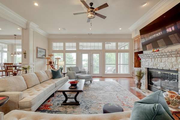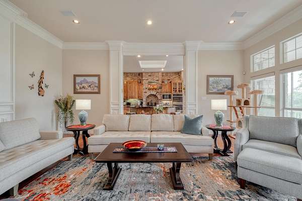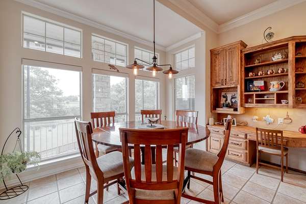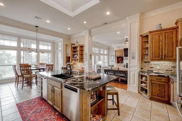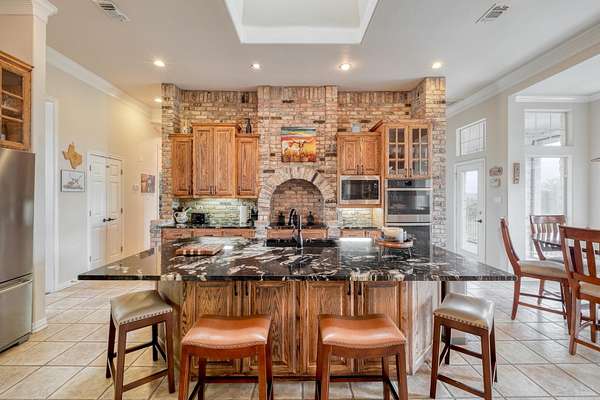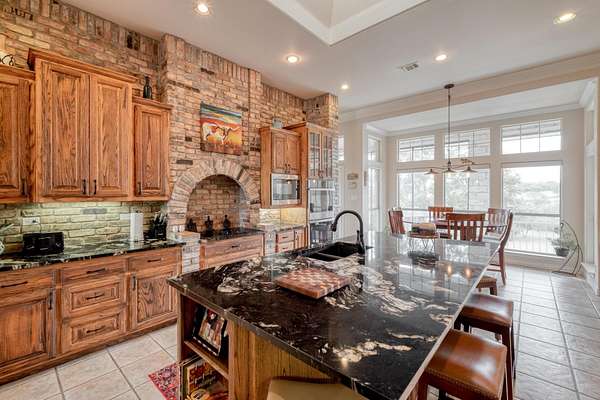 Step inside to soaring ceilings, abundant natural light, and a thoughtfully designed layout. The heart of the home is a show-stopping chef's kitchen featuring custom cabinetry, a dramatic brick accent wall with arched cooktop, and a large granite island perfect for gatherings. Enjoy panoramic views from the breakfast area and entertain with ease in the open-concept living spaces.