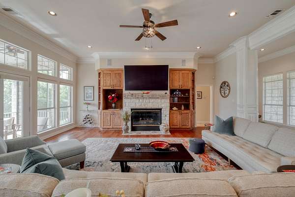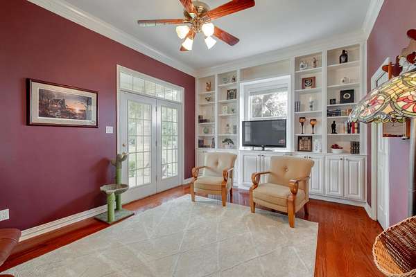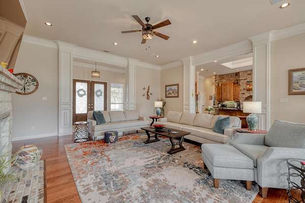 - Bookcases, Built-In Features, Cathedral Ceiling(s), Ceiling Fan(s), Crown Molding, Double Vanity, Eat-In Kitchen, Entrance Foyer, Granite Counters, High Ceilings, In-Law Floorplan, Interior Steps, Kitchen Island, Multiple Dining Areas, Multiple Living Areas, Natural Woodwork, Open Floorplan, Pantry, Primary Bedroom On Main, Recessed Lighting, Tray Ceiling(s), Walk-In Closet(s)