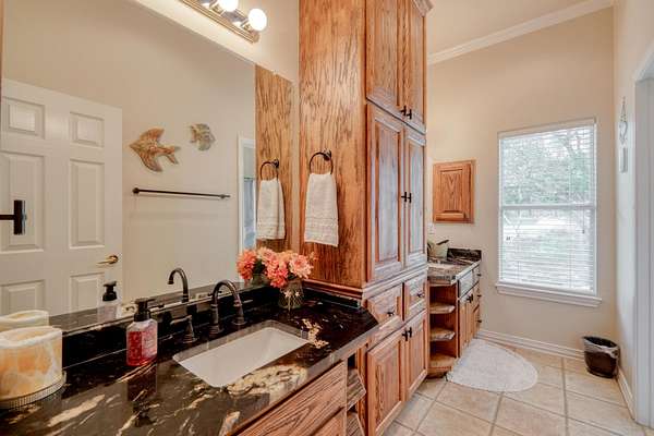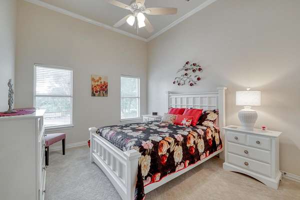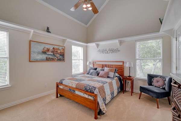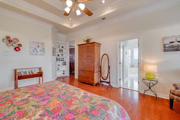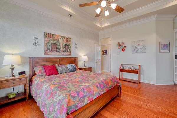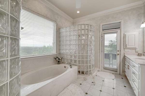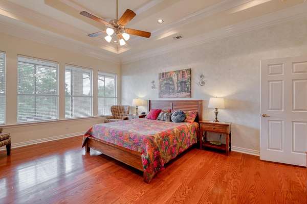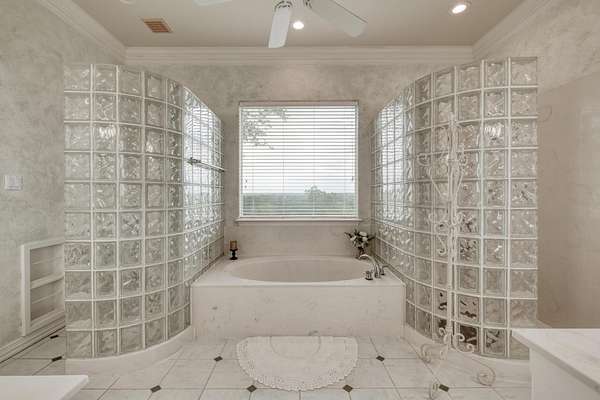 The owner's retreat is your private sanctuary, complete with rich hardwood floors, crown molding, and a spa-inspired en suite bathroom boasting glass block walk-in showers and a deep soaking tub with a view. Additional bedrooms and living spaces offer flexibility for guests, hobbies, or remote work.
