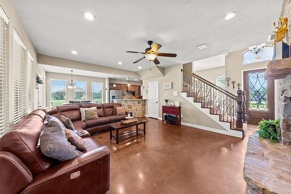 The main level showcases stained concrete floors, a warm and inviting living room, formal dining space, and a well-appointed kitchen with stainless steel double oven and appliances. The isolated primary suite provides a peaceful retreat, while upstairs you'll find two spacious bedrooms and a full bath with a walk-in shower. Built with efficiency in mind, the home includes foam insulation and a high-efficiency HVAC system.