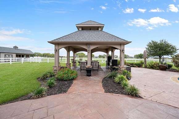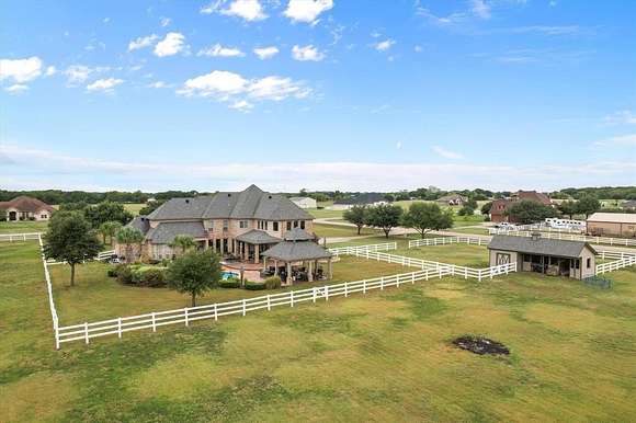 Welcome to a retreat in the prestigious equestrian section of Shiloh Downs. This magnificent estate spans over 3.5 acres offering unparalleled privacy in a gated community. The living room boasts soaring ceilings & a stunning fireplace. The open-concept living area seamlessly flows into the gourmet kitchen, featuring a spacious island, bar-top seating, gas cooktop, double ovens & custom cabinetry. The primary suite is a sanctuary, with its own fireplace & seating area. The ensuite bath is a retreat in itself, boasting dual sinks, luxurious tub & an expansive shower. A dedicated study provides the perfect space for work, while the upstairs game room & media room offer endless entertainment possibilities. Step outside to discover your own private oasis. The sparkling pool & enormous covered pergola are ideal for entertaining & relaxing. Equestrian enthusiasts will appreciate the well-appointed horse barn. Experience the perfect blend of luxury & country living in this exceptional estate.