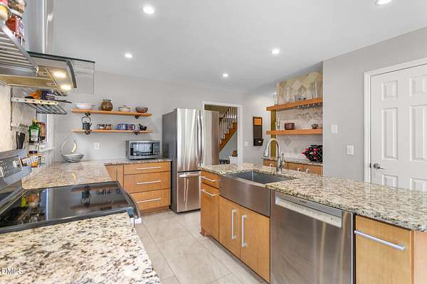 - Bookcases, Built-In Features, Ceiling Fan(s), Granite Counters, Kitchen Island, Kitchen/Dining Room Combination, Open Floorplan, Pantry, Primary Downstairs, Radon Mitigation, Separate Shower, Soaking Tub, Vaulted Ceiling(s), Walk-In Closet(s)