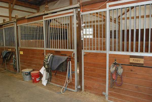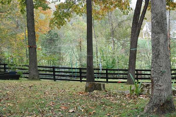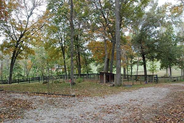 - Board, Covered Deck, Covered Front Porch, Exterior Lights, Fence, Fenced Yard, Landscaping, Mature Trees, Out Building, Outdoor Lighting, Stables, Trees, Woven Wire