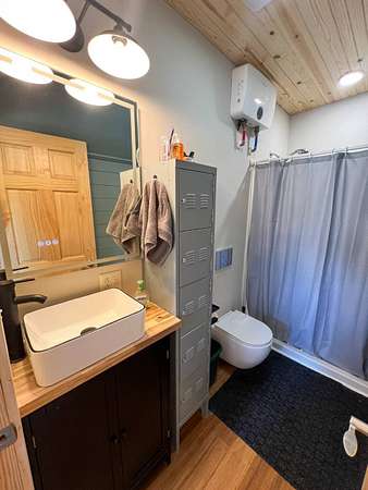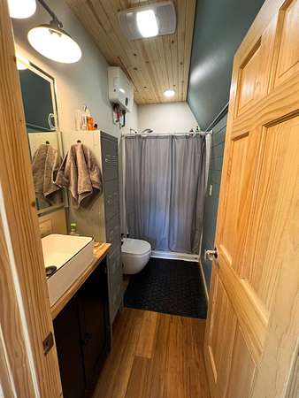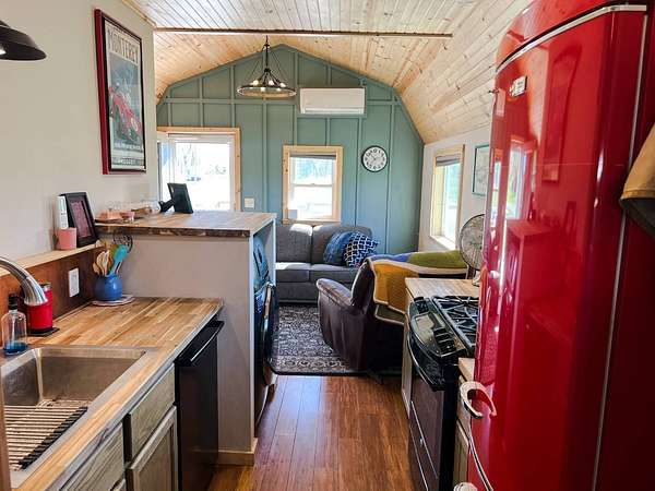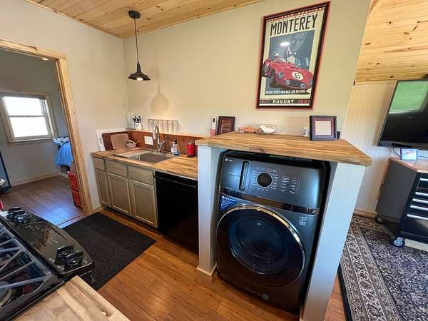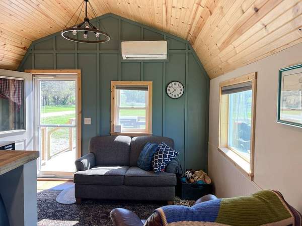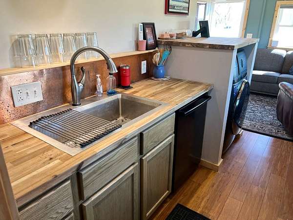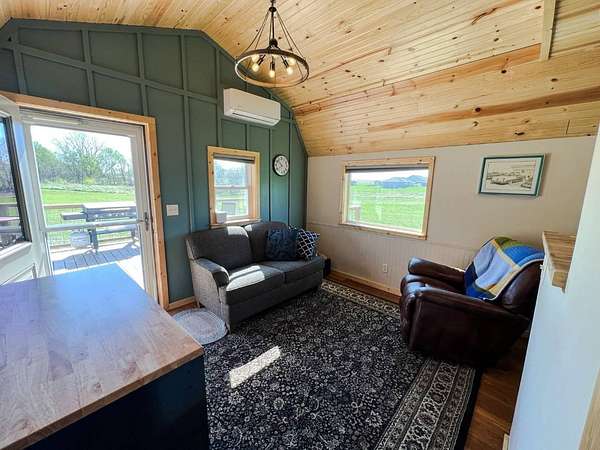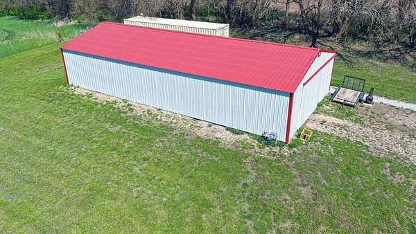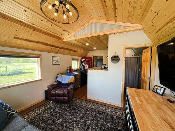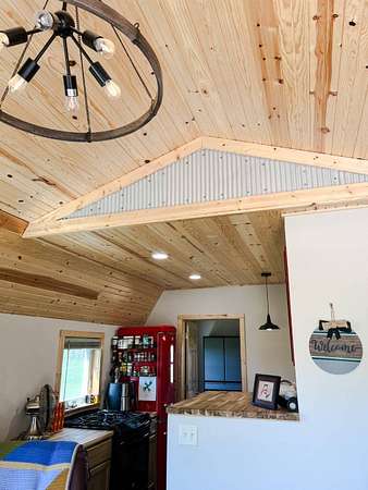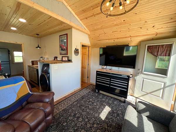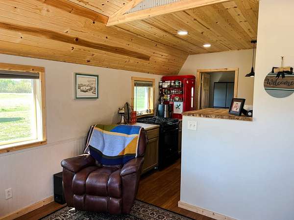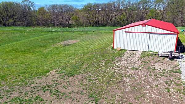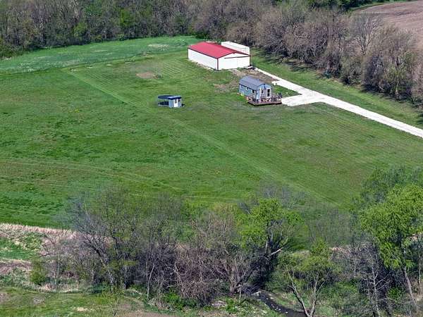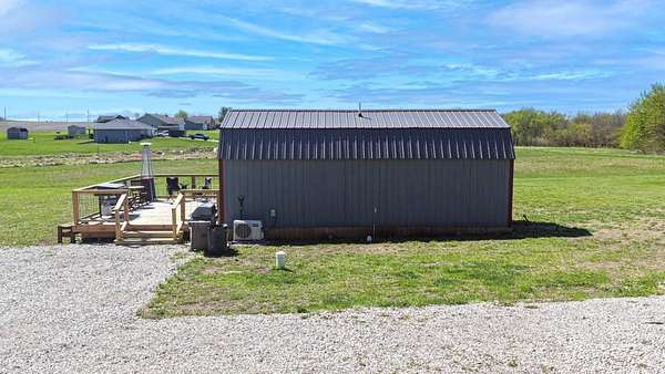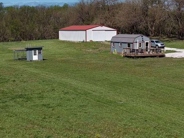 Located on nearly five acres at the edge of Sabetha, this property offers a balance of rural space and convenient access amenities. Schools, grocery store, restaurants, parks, aquatic center, tennis and racquetball courts, and shopping are all nearby, while the property itself is surrounded by mature trees that provide privacy and a quiet setting. The cabin was completed in 2024 and features a beautiful wood ceiling, one bedroom, and a full bathroom with a shower. The kitchen includes a dishwasher and gas oven/range. Thoughtful details such as a touch-activated faucet and heated, lighted bathroom mirror add convenience. A tankless water heater, insulated crawl space with heat tape, and concrete pier foundation add peace of mind. A large wood deck extends from the front of the cabin and overlooks the recently overseeded yard. The property is served by municipal water, sewer, and electric utilities, along with natural gas service through Kansas Gas Service. All utilities were newly installed in 2024, including buried electrical service to both the cabin and shed, water lines and natural gas lines to both structures, and separate breaker panels for each building. A major feature of the property is the 1,800 square foot metal-sided and metal-roofed shed built in 2011. Measuring 60x30 with 10-foot sidewalls, large sliding doors, and a walk-in entry door, the building is suited for a workshop, business use, equipment storage, hobby space, or possible future living quarters conversion. Outside you'll find apple and peach trees, an asparagus patch, and a gravel driveway with underlayment designed to reduce weed growth. The chicken coop is not included but may be negotiable. This property could work well for someone seeking a country setting with the convenience of municipal utilities and proximity to town. It also offers room to build a larger home in the future while keeping the existing cabin for guest use or long term or short term rental income.
