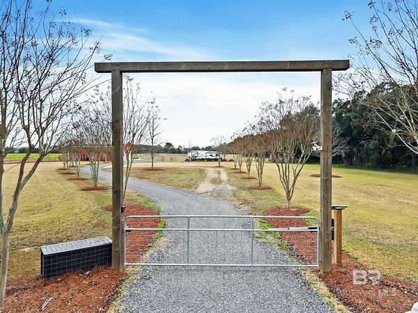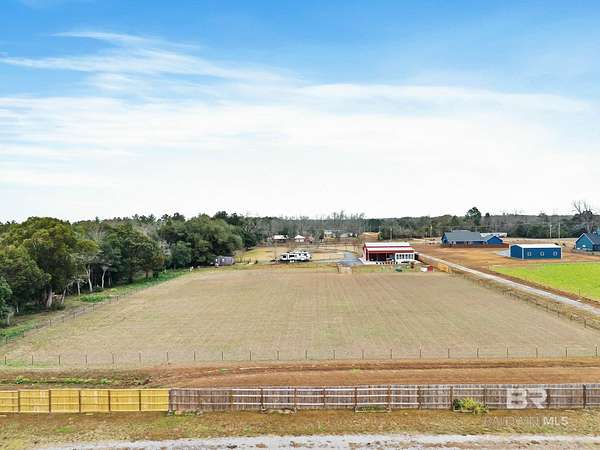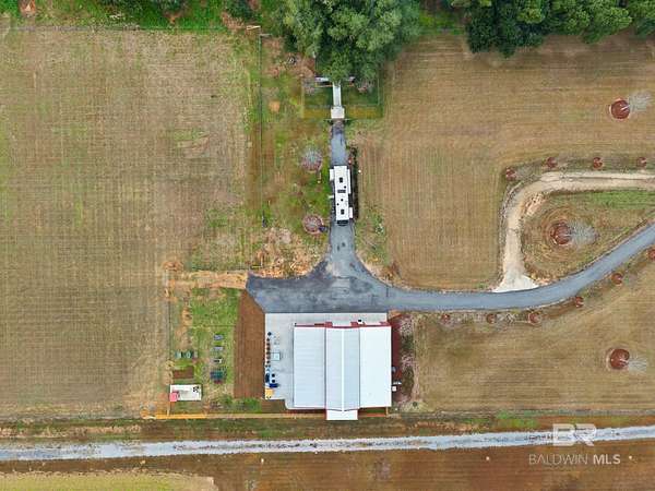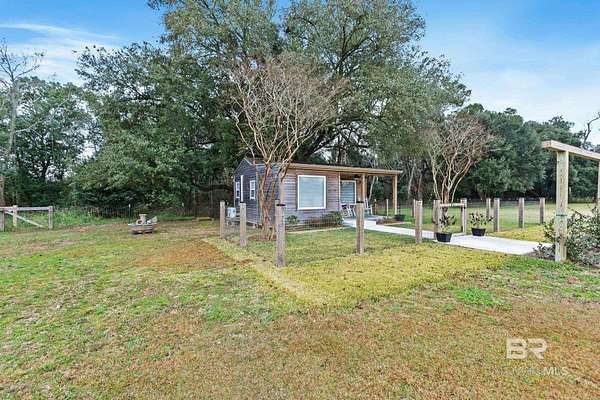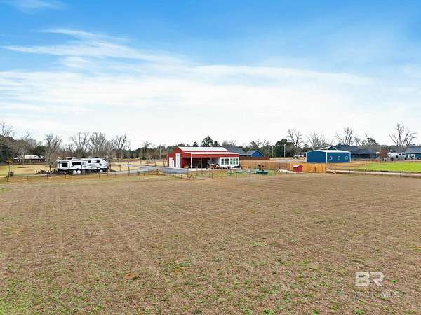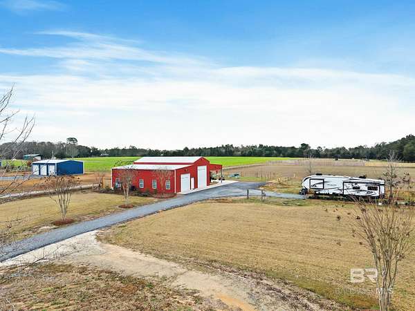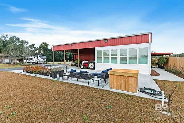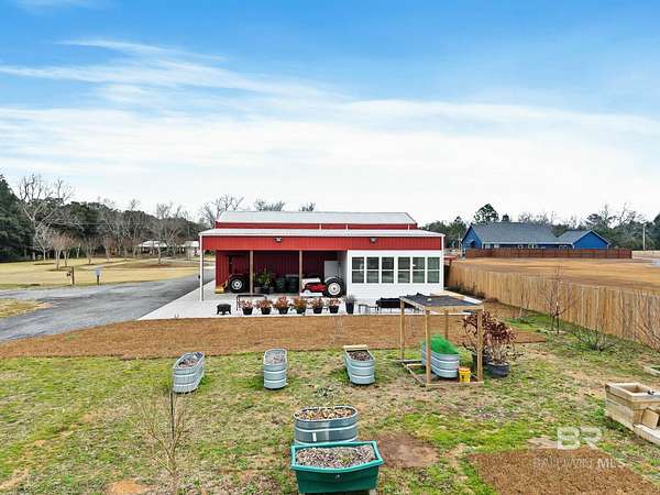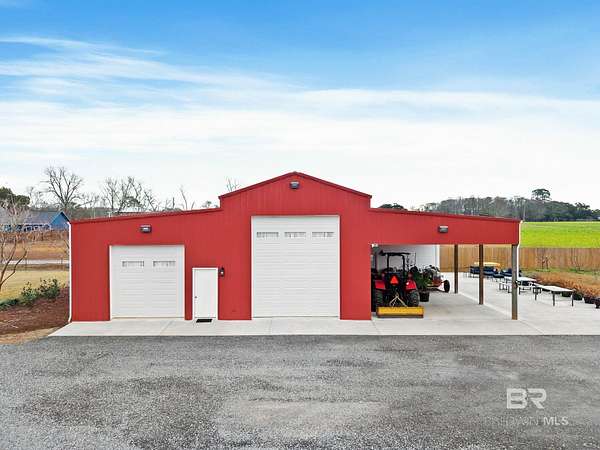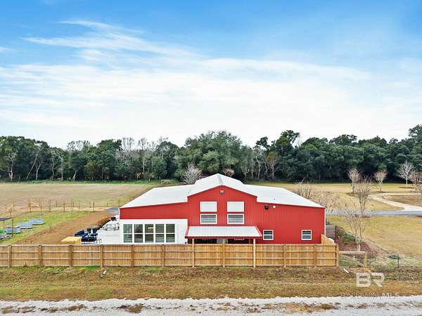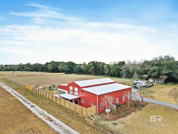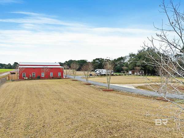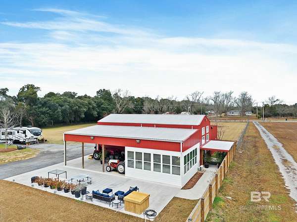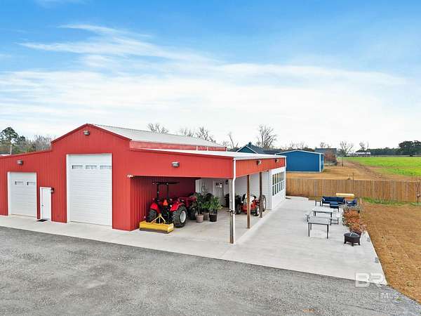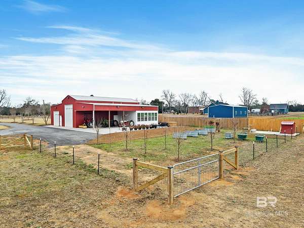 Welcome to a country slice of paradise just a short drive from Alabama's beautiful sandy beaches. This 50x60 barndominium includes a RV hookup inside with water, sewer and electric connections. It also comes with a large bedroom, accessible bathroom, full kitchen and laundry and a new 20'x20' sunroom with extra cabinets, a large sink and an additional refrigerator. The barndo features stainless steel appliances, granite countertops with a tile backsplash, on-demand water heater, luxury vinyl plank throughout the 1200 square foot living area with 36" walkthrough doors, and 2 garage doors (12x14 RV bay and 10 x10) equipped with garage door openers. The barndo also includes 2" faux wood blinds on all the windows and ceiling fans. Off the kitchen of the barndo you will find a covered porch with a sidewalk that leads to the big open patio and oversized carport that is great for entertaining or parking those extra toys (Weeks Bay Boat Launch is just 10 minutes away). There is also an outdoor RV hookup with water, sewer and electric connections. And this is not all. The property is completely fenced with a woven wire fence, and the property is gated with an electric gate with remote openers and a keypad. Another great feature are the oak trees and fruit trees that have been planted on the property. Fruit trees include apple, fig, peach and mulberry plus blueberry bushes planted in an orchard with irrigation. There is also a concrete foundation ready for a garden shed or greenhouse plus galvanized and heavy plastic raised beds. There are also orange, grapefruit and lemon trees in planters on the patio. Also on the property is a small cedar-sided cabin with water and electric which makes a great little place to escape and relax. A Mahindra tractor and 60" Exmark mower plus lawn equipment are available to purchase. Must see to appreciate! Schedule your appointment today! Buyer to verify all information during due diligence.