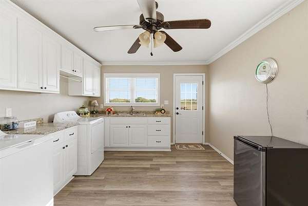 The oversized laundry room is both functional and convenient, offering extensive cabinetry for storage, a full-size washer and dryer area, and a utility sink to handle everyday tasks with ease.