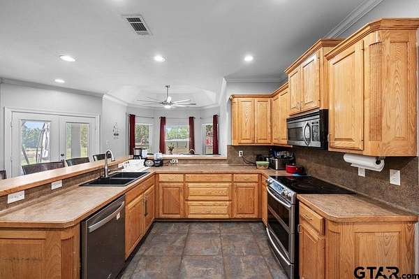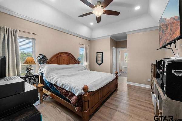 Nestled amidst serene surroundings, this exceptional property offers a harmonious blend of comfort, recreation, & modern living, ideally situated just 10 minutes from downtown Tyler and Lindale, & mere moments from I-20. Boasting three spacious bedrooms, two well-appointed baths, & a 2-car garage, this residential haven extends over 8-acres of picturesque landscape complete with a shared 9-acre private lake. Outdoor enthusiasts will revel in the expansive amenities. Leisurely afternoons await on your private fishing dock or along the expansive 800+- foot shoreline. Recently reconstructed, the dam ensures both practicality and security. A new concrete drive and additional gravel driveway complement the property's aesthetic. The property is meticulously cross-fenced, making it ideal for agricultural pursuits, and includes a robust 30x30 shop with a 2-car carport attached. An additional lien-to behind the shop provides even more functionality for your outdoor needs. The open floor plan of the home seamlessly integrates the new interior updates, including fresh paint and stunning new floors. Vaulted ceilings augment the sense of space, while the warmth of a gas and wood-burning stove invites you to cozy up during cooler Texas evenings. Additional entertainment, a projector and screen in the garage to offer endless movie nights or sports events viewings. PLEASE NOTE: 3 tiny homes are at the front acre of the property do NOT convey. Seller will retain all tiny homes on the front 1.3+- acre. There will be separate driveways and it fenced to separate. The "main" home will be of immediate possession post closing. Contact the listing agent today to schedule your private showing - seize the opportunity to own this incredible lakeside retreat. Experience the unbeatable lifestyle that this lakeside 8-acre property can offer.