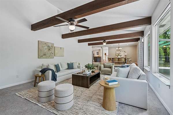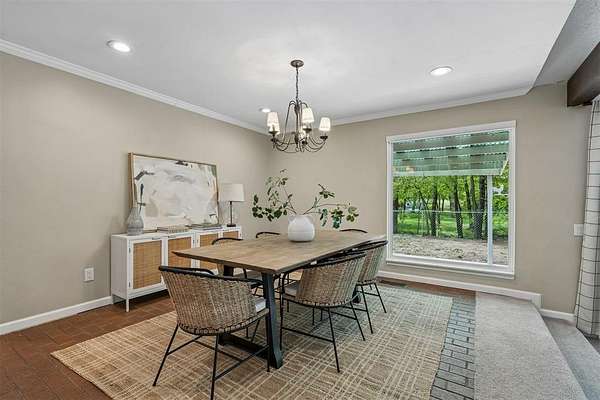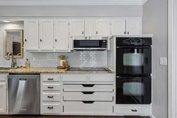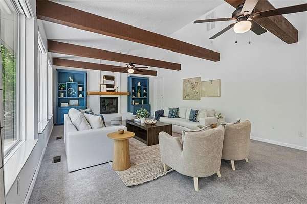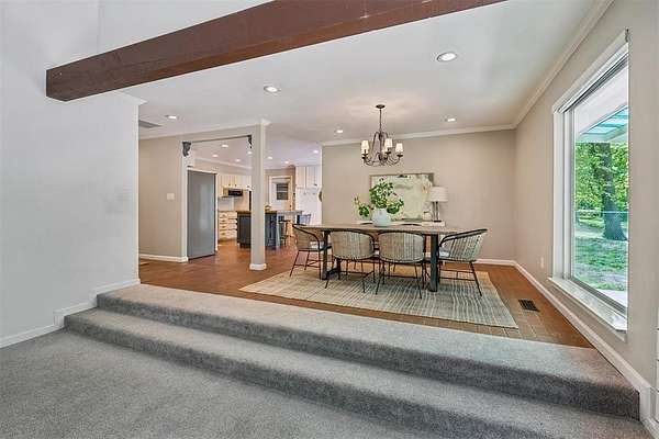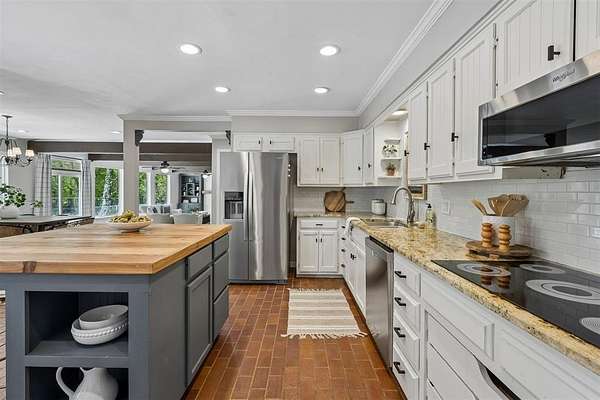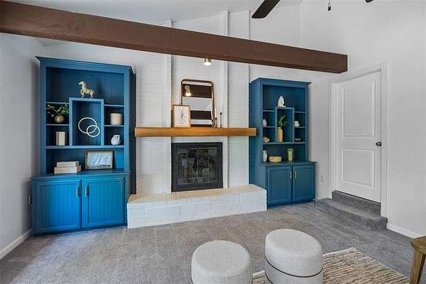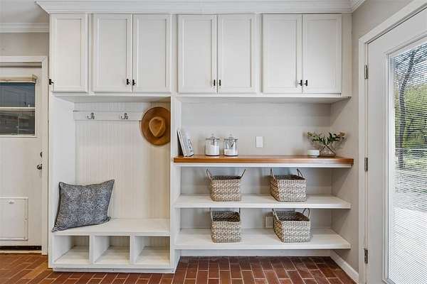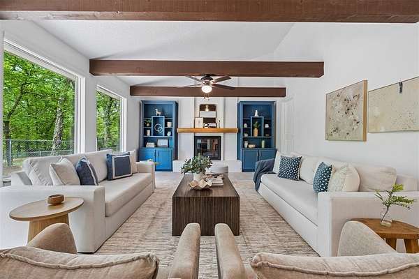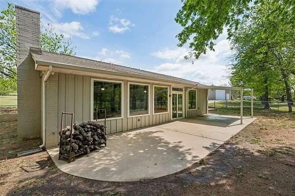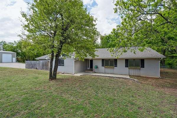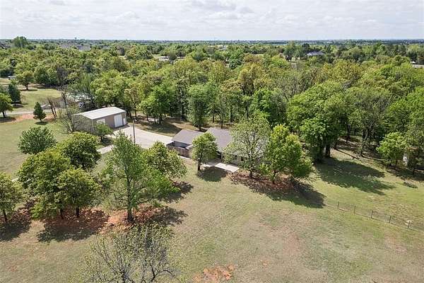 Tucked away on a wooded homesite of just over two acres in highly sought-after Deer Creek Schools, this beautifully updated 4-bedroom, 2.5-bath home offers the perfect blend of privacy, space, and convenience just minutes from Edmond's shopping, dining, and everyday amenities. From the moment you step inside, you're welcomed by charming brick tile flooring, modern paint tones, and a warm, inviting layout. The spacious living room is a true centerpiece, featuring a raised ceiling with exposed beams, a wood beam fireplace mantle, custom built-ins, and oversized picture windows that flood the space with natural light while showcasing serene backyard views. The living area flows seamlessly into a large dining space, ideal for gatherings and everyday living. The kitchen is both functional and stylish, tons of storage, stainless steel appliances, double ovens, a subway tile backsplash, and a stunning island with a natural wood top and additional storage. The refrigerator stays with the home. Just off the back porch, a thoughtfully designed mudroom provides built-in bench seating, cabinets, and extra storage. The private primary suite is a retreat of its own, highlighted by cathedral ceilings and beautiful natural light, along with access to a private porch. The en suite bathroom features dual vanities, a large walk-in closet, and an oversized walk-in shower with double shower heads. Secondary bedrooms are generously sized, and the hall bathroom includes dual vanities for added functionality. The laundry room is has a sink, work surface, and plenty of storage. Step outside to enjoy the large back porch overlooking peaceful, wooded acreage. Perfect for relaxing or entertaining. The 30x40 shop building with electric and 220 amp outlets offers incredible flexibility for hobbies, storage, or workspace. This is a rare opportunity to enjoy acreage living with modern updates and close proximity to everything Edmond has to offer.
