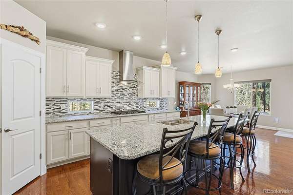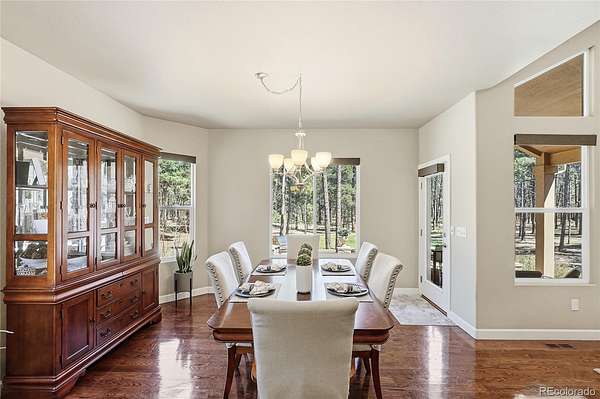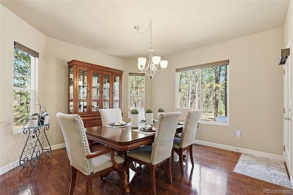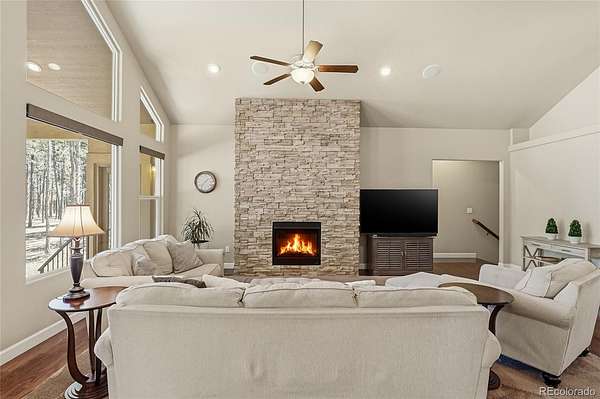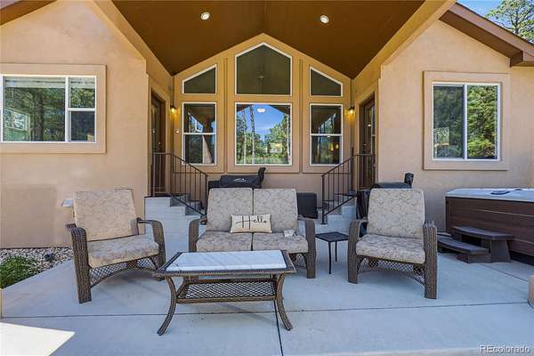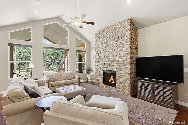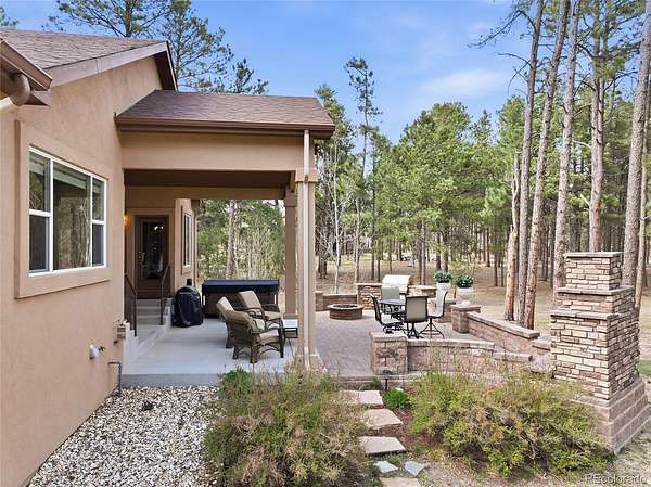Private Pines Ranch Retreat located in the gated community of Black Forest Reserve. This beautifully crafted custom-built ranch home offers the perfect blend of comfort, space, and serenity. This well-maintained, one-owner residence sits on a picturesque 3.39-acre treed lot, providing a private, quiet and peaceful setting nestled in the woods. The main level is open and inviting and features vaulted ceilings, wood floors, abundant natural light, and a stunning stone gas fireplace. The open-concept layout seamlessly connects the kitchen, dining, and living areas—ideal for everyday living and entertaining. The kitchen is complete with stainless steel appliances, a gas cook top, granite countertops and a walk-in pantry. The kitchen and dining area walk out to the back patio for easy access to the built-in gas BBQ, gas firepit, wood-burning fireplace and hot tub. A wonderful outdoor living space where you can enjoy the peace and quiet of Black Forest. The main level also includes a convenient laundry room off the garage and two bedrooms , including a versatile secondary bedroom or home office. The spacious primary suite offers private access to the back patio with a luxurious primary bath, large walk-in closet, rain shower and soaking tub. The fully finished basement includes a large recreation room with a pool table, fireplace, wet bar, an unfinished storage room/workout room and two additional bedrooms and bathrooms. One of the secondary bedrooms includes an attached bathroom, offering added comfort and privacy for guests or family. Additional highlights include main level and basement surround sound, a drip irrigation system, a finished 3-car garage, and a dedicated fenced dog area for safe and convenient outdoor use. This property combines privacy, functionality, and inviting indoor-outdoor living—an exceptional place to call home.