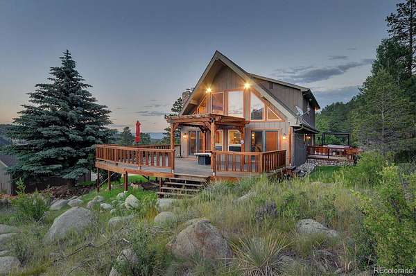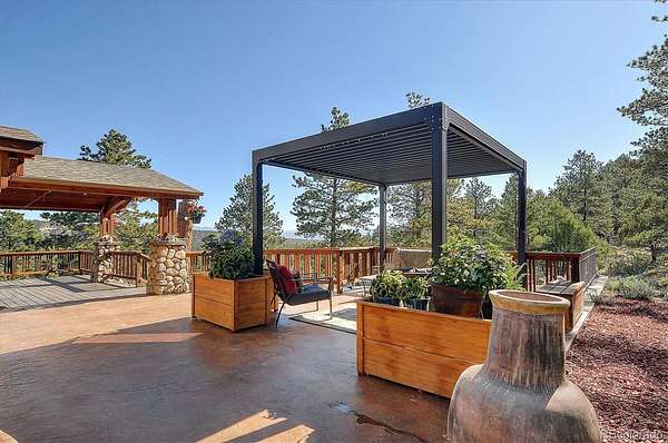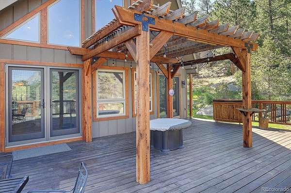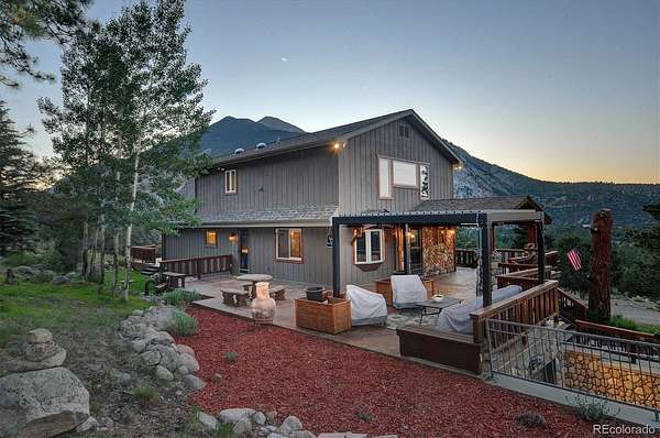 Imagine waking up to jaw-dropping Chalk Cliff views… A stunning home on 6 beautifully treed acres captures remarkable Chalk Cliff views from inside the home and the outdoor living spaces! Located in a truly breathtaking and private location, this custom home with two detached garages has all the elements for a legacy property to enjoy now and for future generations. With 3346 SF on three levels, this home offers flexibility, utilizing expansive indoor and outdoor living spaces. The main floor of this recently renovated home includes astounding views with floor-to-ceiling windows in the living and dining room, opening up to the spacious deck on the west side of the home, perfect for hosting under Colorado skies. Easy open floor plan on the main level that flows from an updated kitchen to dining, on to the living room, highlighted with a stately stone and slate gas fireplace. The views from this inspiring kitchen, together with granite countertops, attractive wood cabinets, a seating nook, and slate tile, create the perfect space for hosting large gatherings on the impressive wrap-around deck on the east side of the home with a pergola and fire pit for easy entertaining. Custom kitchen features an abundance of storage and counter space with a large center island and a second prep sink. A nice bedroom, full bath, and laundry complete the main level floor plan with 4 access points to the outdoors. Upstairs, the primary suite feels like its own sanctuary with bonus space for an office or quiet sitting area, complemented by a spa-inspired primary bath with a walk-in closet. Lower-level in-law suite provides privacy and features a kitchenette, 3/4 bath, den, office space, and workshop. Enjoy the attached heated 2-car garage, complete with hot tub; 2nd detached garage, and the detached RV garage. The attention to detail, thoughtful and consistent maintenance, combined with an absolutely gorgeous lot, presents a rare find and impressive retreat.