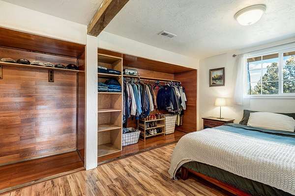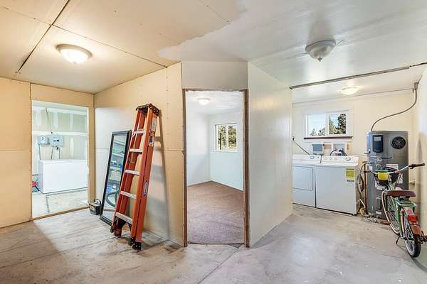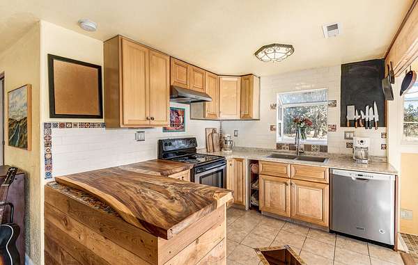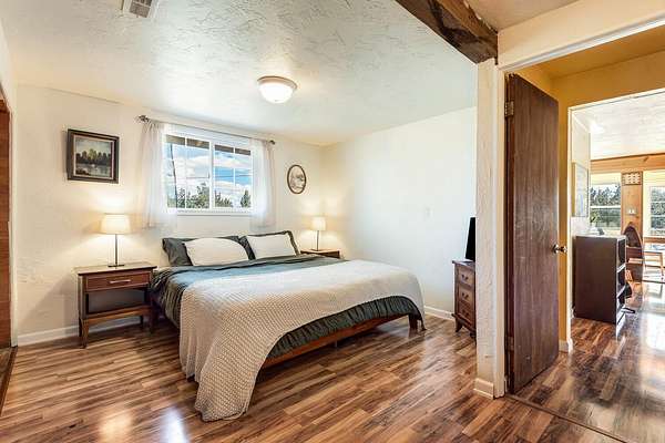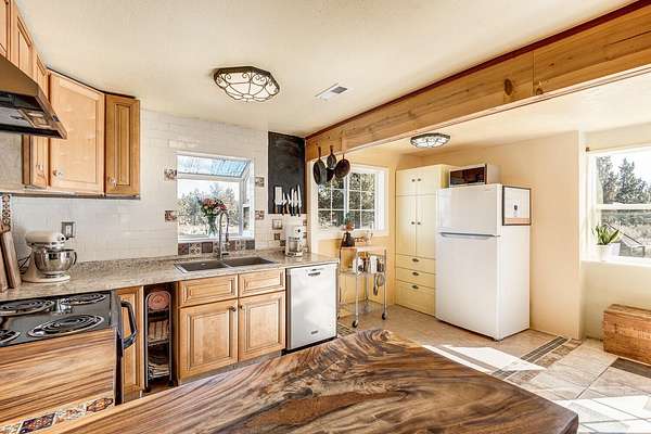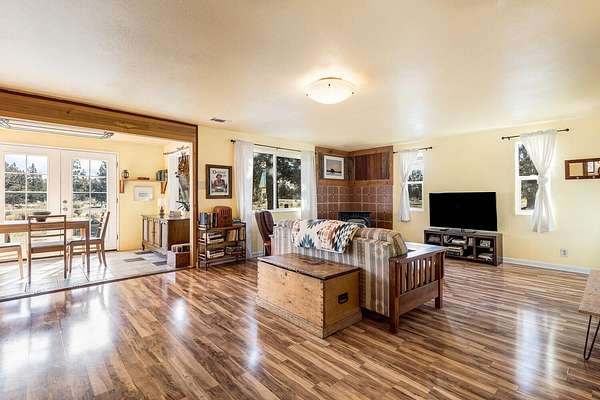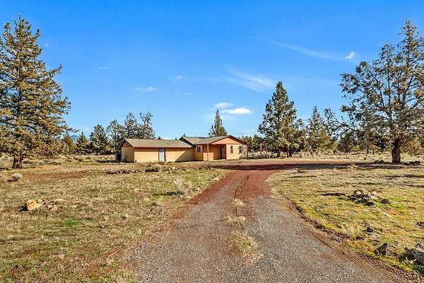 Artsy charm meets wide-open space! This 957 sq ft, 2-bedroom, 1-bath home sits on 5 acres with soft views or plenty of room for your dream home. Creative touches throughout add warmth and personality. The light-filled living space features plenty of windows, French doors to the patio and a inviting pellet stove. The kitchen offers generous storage, acacia wood and Corian countertops, tile floors, and a cheerful garden window. All appliances included. Recent updates: roof (2020), forced air electric furnace with heat pump, and water heater. Former garage space works as a workshop, studio, storage, or can be converted back. Minutes to trails, Steelhead Falls, golf, pool, tennis, Food Trucks and other Crooked River Ranch amenities. Space, character and potential!