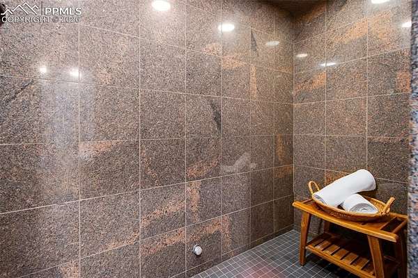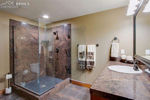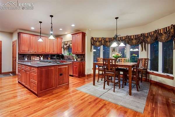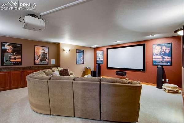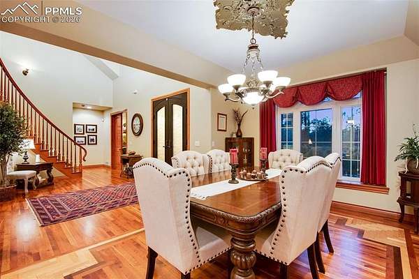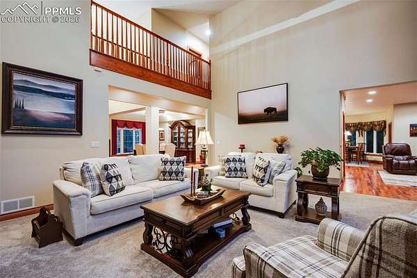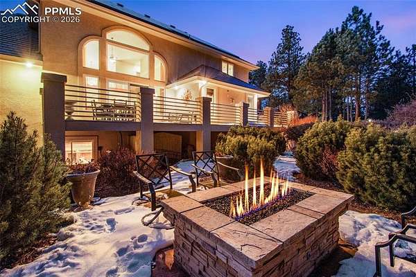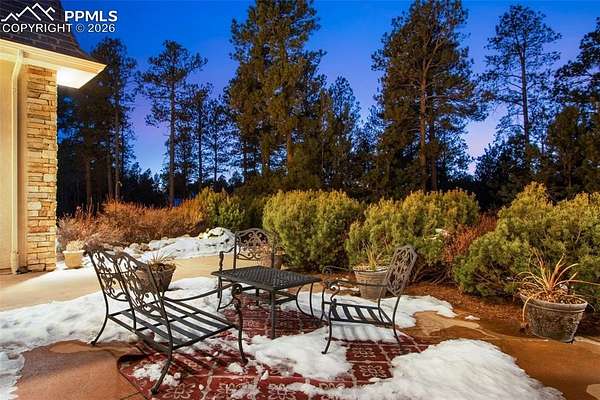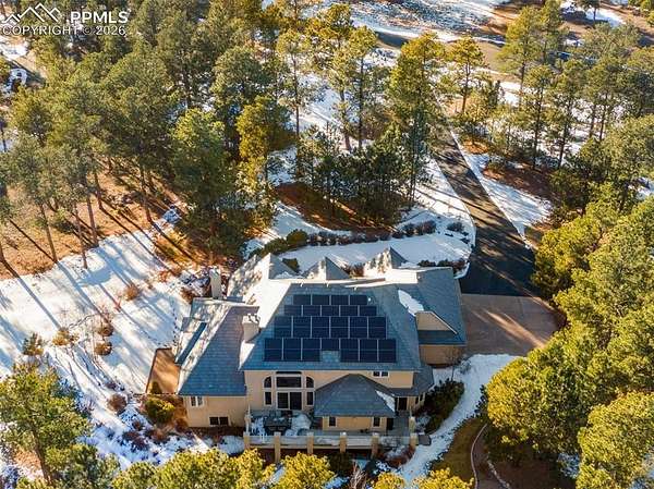 Exceptional custom home in the gated community of High Forest Ranch. A grand two-story foyer with a sweeping staircase and refinished hardwood floors creates an impressive entry. The living room offers 20-foot ceilings, a wall of windows overlooking trees, a gas fireplace, and custom built-ins-ideal for daily living and entertaining. The gourmet kitchen features custom cabinetry, granite countertops, and updated high-end stainless appliances, including double ovens, gas cooktop, wine refrigerator, built-in refrigerator, and a large pantry. The formal dining room is perfect for gatherings, while the adjoining sitting area with a gas fireplace provides a cozy space to relax or watch TV. The main-floor primary suite is a private retreat with abundant natural light, a sitting area with gas fireplace, and a five-piece bath with oversized tub, walk-in shower, dual granite vanities, and a spacious walk-in closet. Also on the main level are a private office, powder bath, and large laundry room. Upstairs, three generously sized bedrooms each include an en-suite bath. The walk-out basement is designed for entertaining with a double-sided stone fireplace, kitchenette, theater room with screen, projector, and sound system, plus a large sectional-all included. A gym or bonus room with bath and steam shower and a second primary-style bedroom with en-suite bath complete the lower level. Additional features include owned, transferable Tesla solar panels and new furnaces installed in 2025. Outdoor living includes a large deck, paved patio with hot tub, fire pit, playset, playhouse, and in-ground trampoline. Conveniently located near Highway 83, I-25, the Air Force Academy, Powers Corridor, downtown Monument, shopping, dining, District 38 schools, and major hospitals. Lovingly cared for and truly special-this is the place to call home!