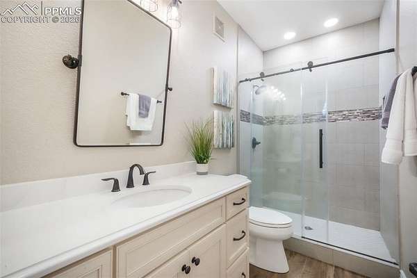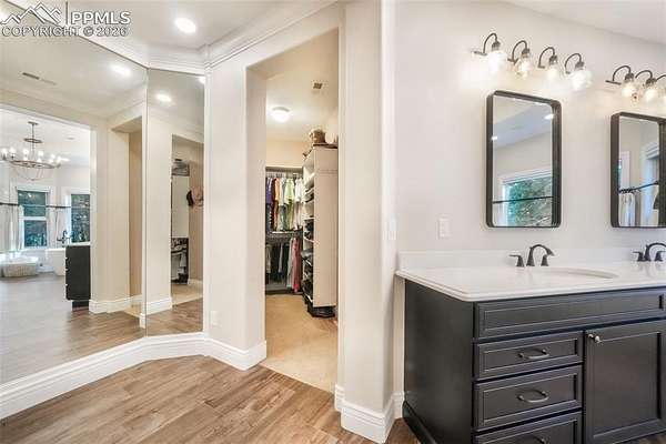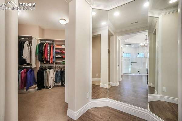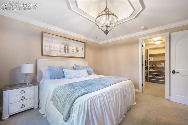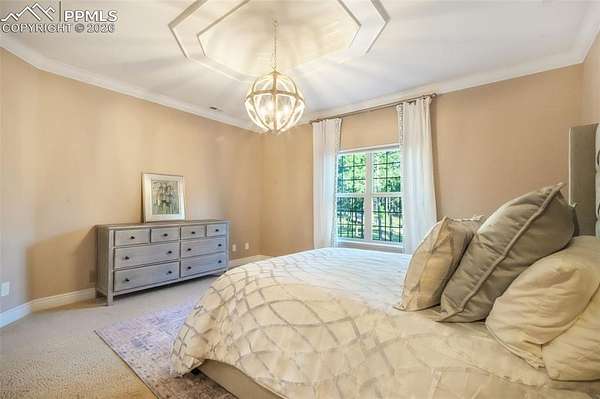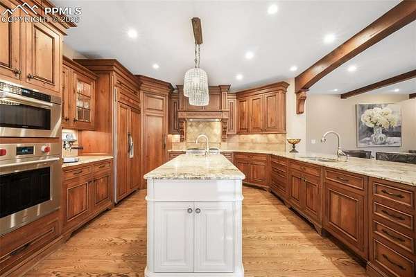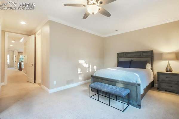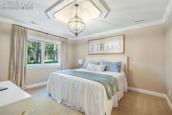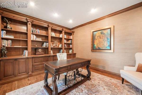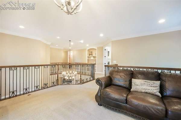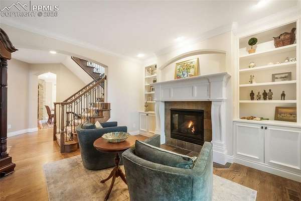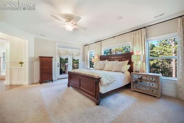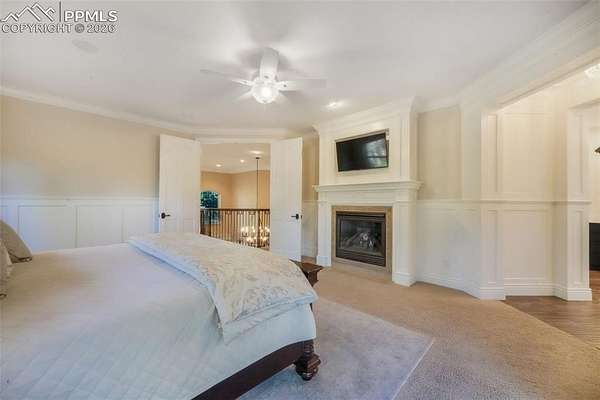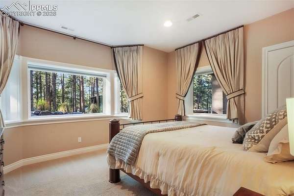 Nestled on 4.31 serene acres at the top of a private cul-de-sac, this 5,937 sq. ft. custom home in the exclusive gated community of High Forest Ranch offers a rare blend of luxury, privacy, and elegance. With 5 spacious bedrooms, 4 bathrooms, and a 3-car heated garage, this residence is thoughtfully designed for both comfort and entertaining. From the moment you enter the grand foyer with heated tile floors, you'll appreciate the craftsmanship and attention to detail. A private study with built-in wood shelving and glass French doors sits to the left, while to the right the formal sitting room features a gas fireplace and elegant built-ins. The expansive family room boasts a dramatic stone fireplace with wood mantel, large windows, and natural light throughout. The gourmet kitchen is a chef's dream with high-end Wolf appliances, custom cabinetry, leathered granite countertops, a center island with vegetable sink, walk-in pantry, and a charming breakfast nook with built-in desk and deck access. A butler's pantry connects to the formal dining room which has an additional outdoor deck. Upstairs, the luxurious primary suite includes a gas fireplace, private deck, spa-like bath with heated floors, standalone tub, large shower, dual vanities, and dual walk-in closets. Two additional bedrooms share a Jack-and-Jill bath, and a loft area offers built-in desks and a cozy window seat. The walk-out basement includes two more bedrooms, a wet bar, rec room, family room with fireplace, and ample storage. Outside, enjoy the built-in fireplace under a pergola, hot tub, and the beauty of mature trees. Additional features include paid-off solar panels w/ Tesla storage system, Russound MCA amplifier, invisible dog fence, custom lighting, hot tub, exterior fireplace, garden beds, exterior landscape lighting and so much more. Located just off Hwy 83, with quick access to Colorado Springs, Monument, and Denver-this is truly a must-see home.