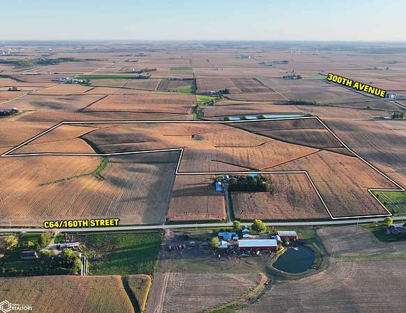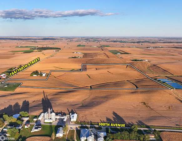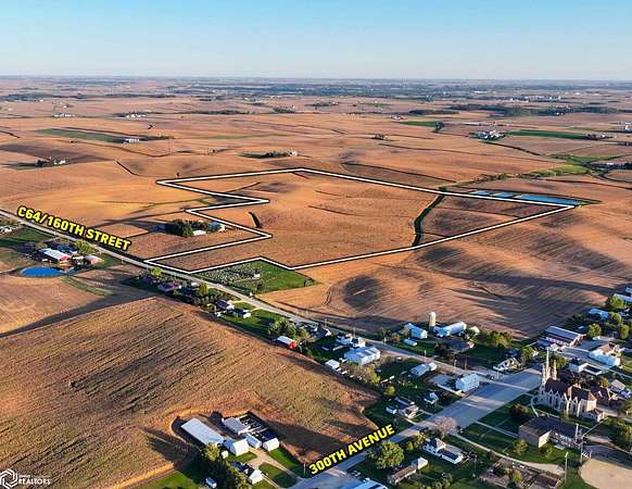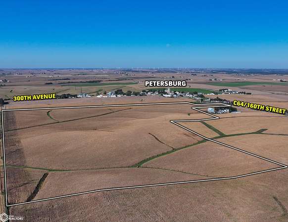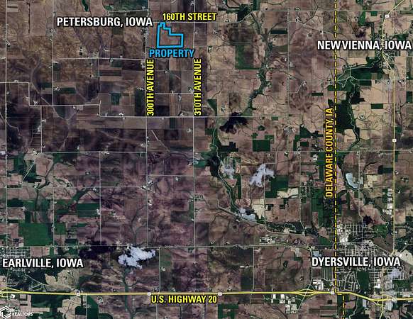 Dyersville: Drive west on HWY 20 for 5 miles, then turn right onto 300th Ave, traveling 1 mile, then turn left onto 210th Street for 0.3 mile, then turn right back onto 300th Ave for 5.1 miles to Petersburg, where you will turn right onto 160th Street for 0.3 mile, and the property on the right.