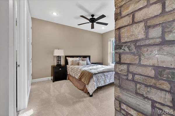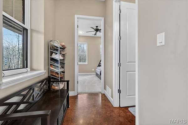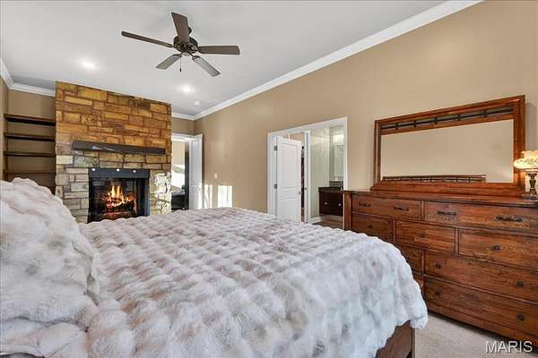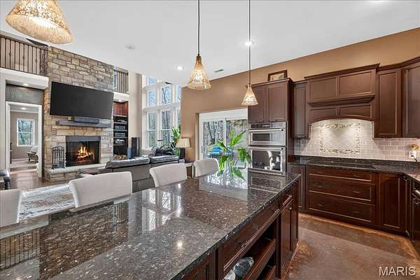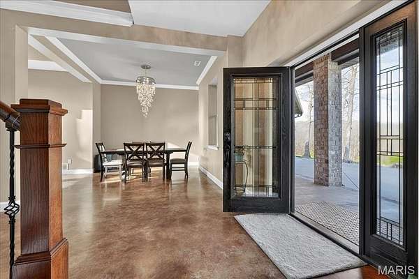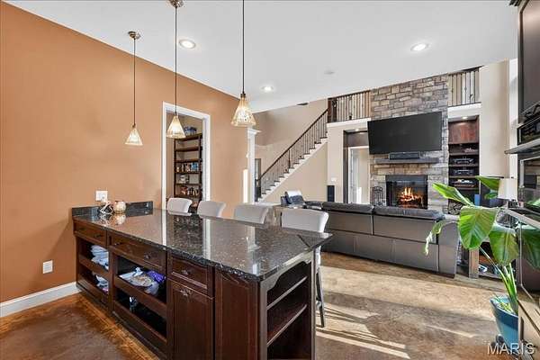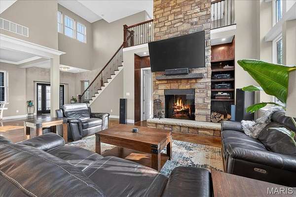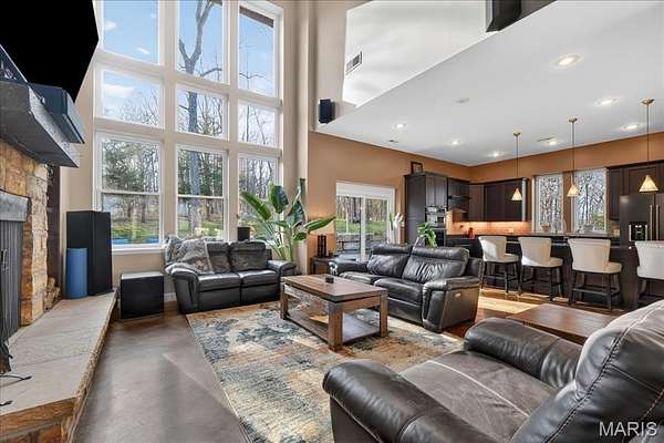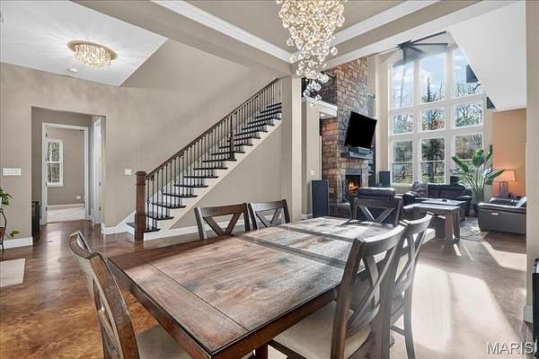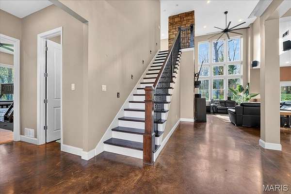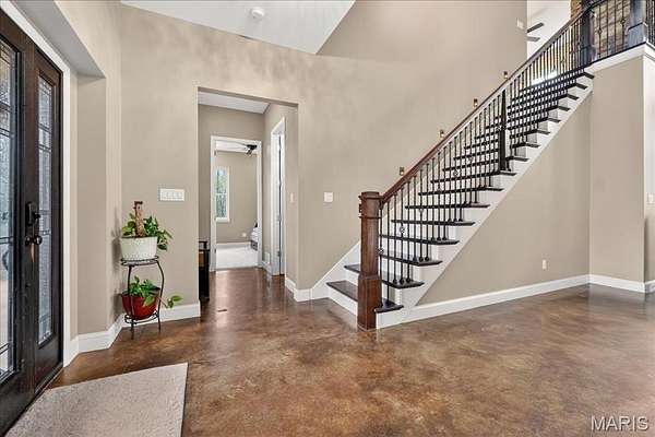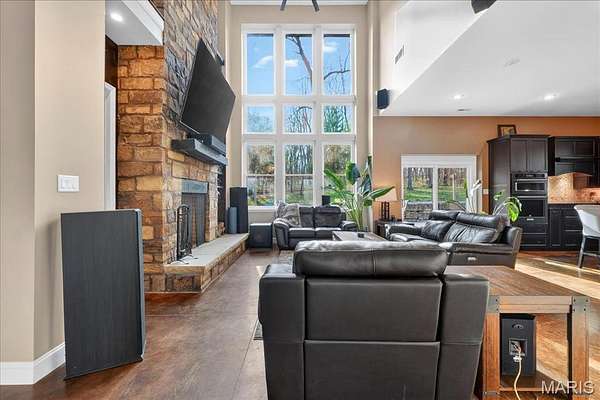 A large covered front porch welcomes you into an open entryway and stunning great room with 20’ ceilings and a breathtaking floor-to-ceiling, see-through stone fireplace. The home showcases 6" baseboards throughout, stained concrete floors, and quality finishes at every turn.