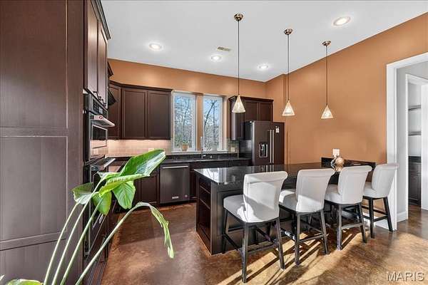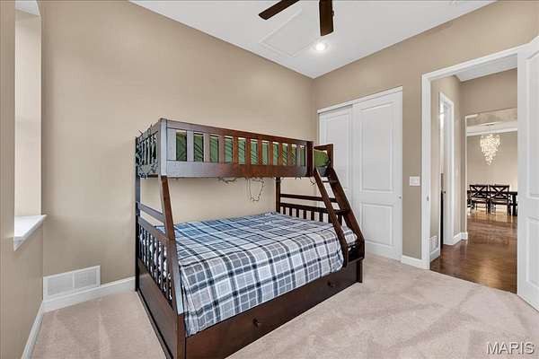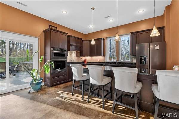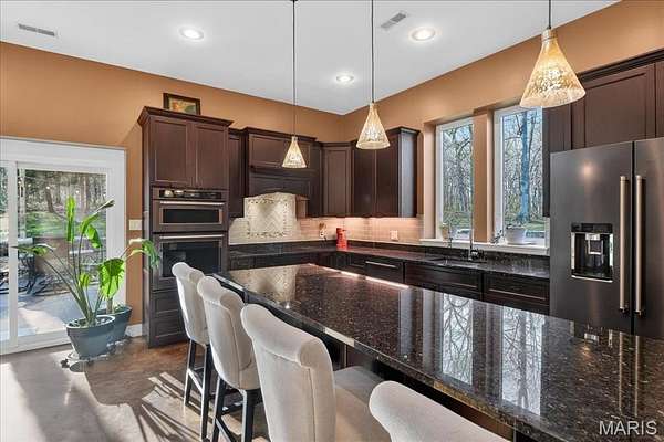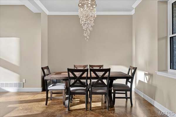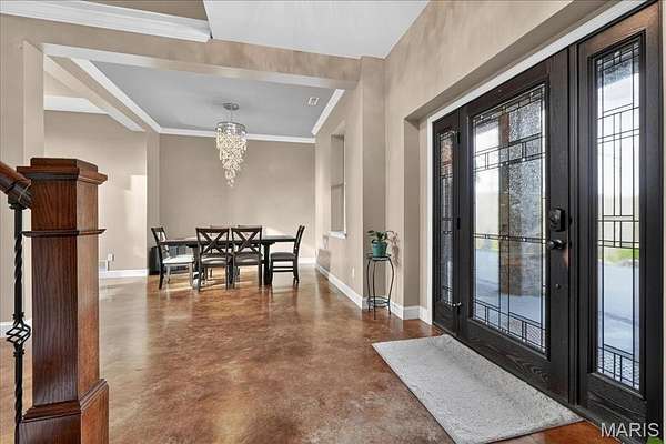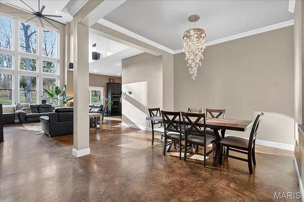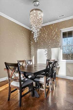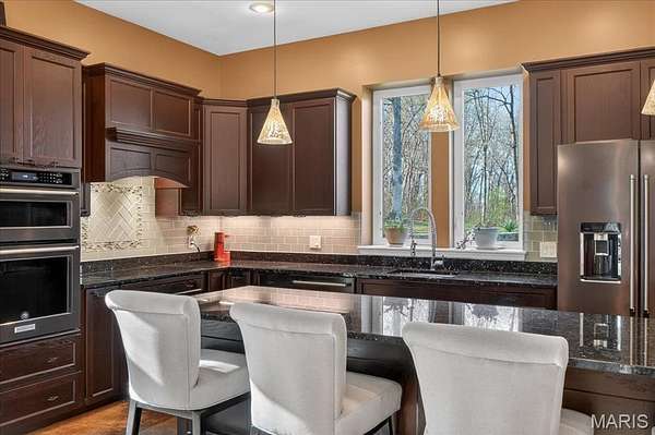 The kitchen is designed for both everyday living and entertaining, complete with black stainless steel appliances, double oven with induction cooking, a large breakfast bar, Amish-made cabinetry with pull-out shelving, and a convenient walk-through pantry. The main floor laundry and separate mud room adds to the home’s thoughtful layout, while the dining room is elevated with elegant crown molding and a beautiful glass chandelier.