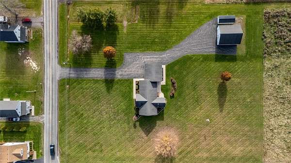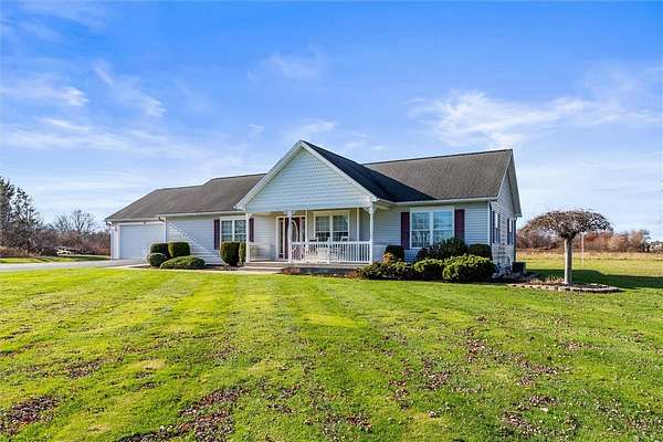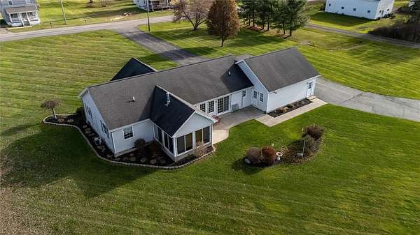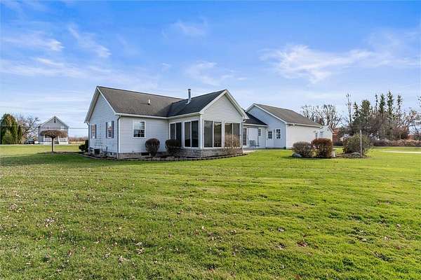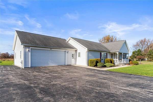 Unicorns do exist it appears!! ~ This one-of-a-kind property oozes curb appeal, and allows for country living, while being only minutes from the village ~ Situated on 5 acres, and on sewers, this well-maintained 1633 SF ranch allows for comfortable and easy living ~ The cozy front porch is the perfect spot for your morning coffee, or a good book ~ Large family room, complete with gas fireplace, greets you as you enter ~ Adjacent to the family room, you'll find the spacious primary suite ~ Kitchen boasts both a breakfast bar and an island, for your convenience ~ Heated sunroom is a great place to unwind and relax ~ Two sliding glass doors lead to the outside patio, which offers peaceful views of this serene setting ~ 1st floor laundry ~ Vinyl windows and trim throughout ~ 4-car garage has heat, plenty of storage, and a center drain ~ Impressive 2-story heated outbuilding is currently being used as a full service shop, the possibilities are simply endless with this desirable space ~ Do not miss out on this unique gem , make it yours today!!! Delayed negotiations until Tuesday December 9 @ 2:00 pm