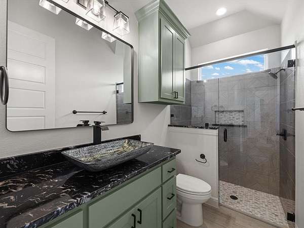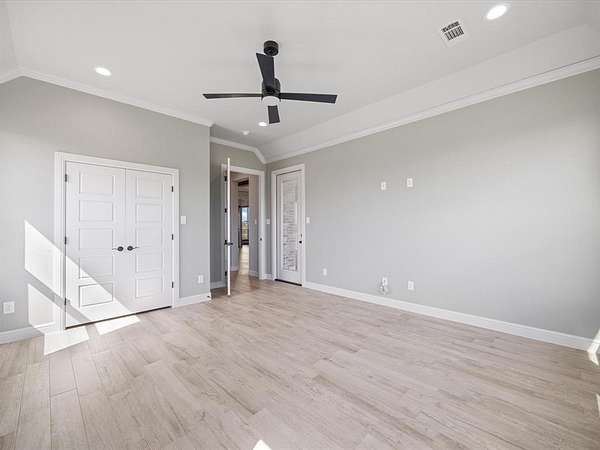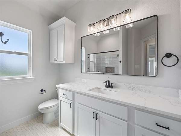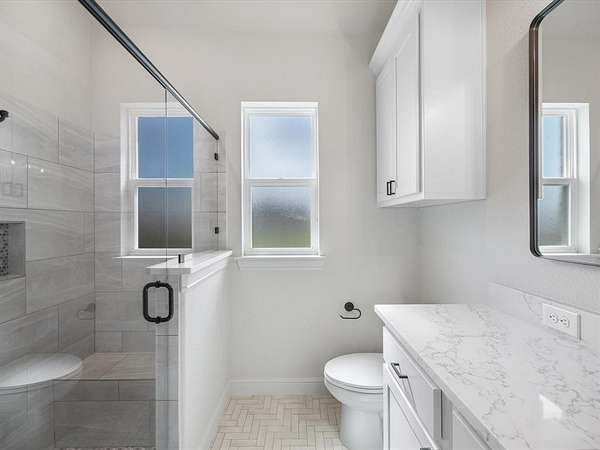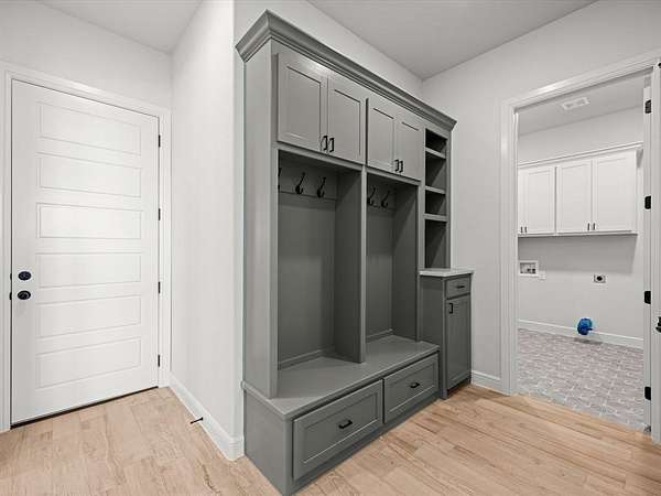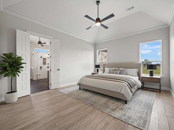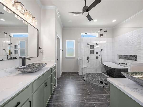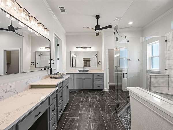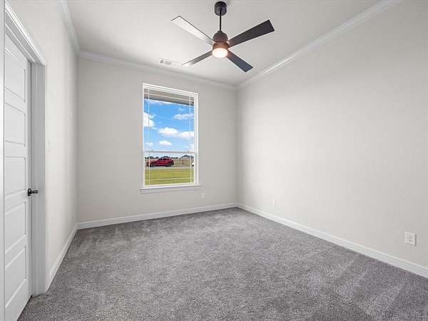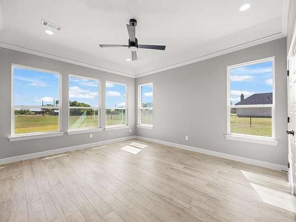 The split-bedroom floor plan provides privacy for the primary suite, where you'll find a spa-like bath with a soaking tub, frameless glass shower, and generous walk-in closet. Two secondary bedrooms share a full bath, and a dedicated office or flex room offers the perfect space for remote work or hobbies.