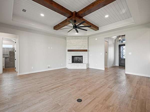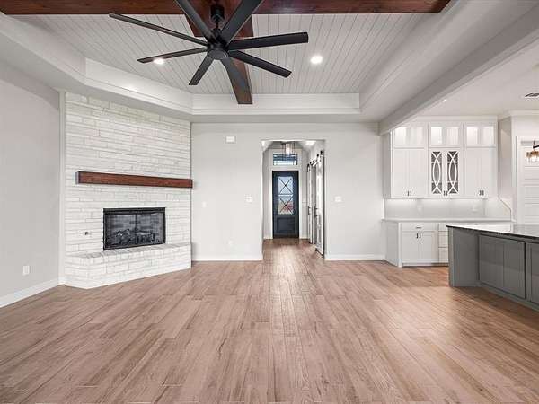 Step inside to find a spacious open layout filled with natural light, luxury vinyl plank flooring, and a warm, inviting living area centered around a cozy fireplace. The kitchen is thoughtfully designed for both everyday living and entertaining, featuring a large island, custom cabinetry, stainless appliances, and a walk-in pantry.
