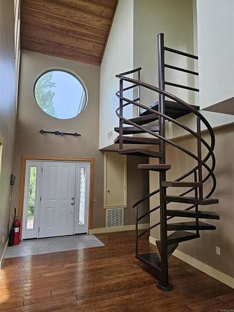 Welcome to this spacious and beautiful home nestled on 20+/- private acres, offering the perfect blend of elegance, comfort, and natural beauty. A picturesque tree-lined driveway sets the tone as you arrive at this serene retreat. Step through the entryway and be greeted by a grand spiral staircase that leads to an expansive upper-level bedroom with a cozy sitting area and access to a private balcony. The Great Room and dining area feature soaring vaulted ceilings, an abundance of natural light, and a charming wood-burning stove. The gourmet kitchen is a chef's dream, boasting granite countertops, custom pull-out drawers, under-cabinet and recessed lighting, tile flooring, and premium finishes throughout. Additional highlights include a 20x24 storage building with electricity and water, plus an additional storage building with electricity--perfect for tools, hobbies, or extra storage space. The home also features a double carport/cover. Outside, you'll enjoy approximately 55 fruit-bearing trees and bushes, plus the 8,000 sq. ft. raised-bed gardens. Whether you're looking for a retreat, a place to entertain, or your forever home, this property has it all.