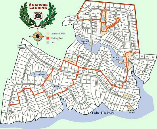 Come build your dreams on this just shy of one-acre lot in the waterfront gated community of Anchors Landing on Lake Hickory in Granite Falls, NC. The neighborhood boasts spacious lots with a quiet, tranquil feel, perfect for relaxing and enjoying life to the fullest. The Lot is currently fully wooded with a predominantly mature age class of pine with some mixed in hardwoods as well. We have a completed perk test from a registered NC soil scientist as well, so you already have a jump start on beginning construction of your new home. The lot is relatively flat with a small, gradual slope towards Greens Road, facilitating much easier site development for construction.