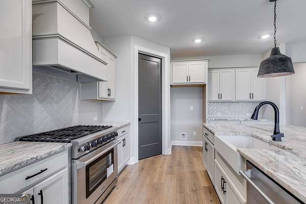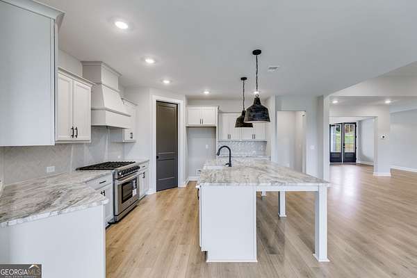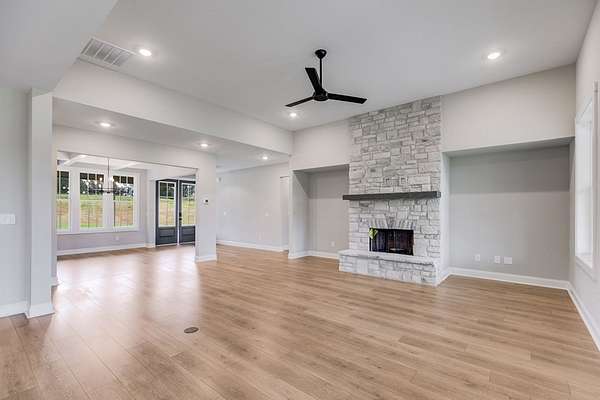 WOWZER! This house is BIG and BEAUTIFUL and has so much CHARACTER! The angled footprint of this home is unique and charming. There's a coffered ceiling in the oversized family room with a stone wood burning fireplace. The kitchen has a large central island and there is a COMMERCIAL THOR GAS RANGE with a Decorative Vent Hood in the elegant kitchen. The Owner's Suite features a vaulted ceiling with wood beams, tiled bathroom with oversized shower with bench and a soaking tub, two closets and the bedroom leads to a nice covered terrace. The kitchen has a covered grilling terrace off the breakfast nook. There is a formal dining room with a sunken wall niche. There are two secondary bedrooms with a full bathroom and powder room also on the main level. Upstairs you'll find two more bedrooms, full bathroom and a Media Room/Office/Bonus Room. Spray foam insulation in the attic, SMART HOME PKG equipped, a superb 1-2-10 Warranty (with 10 year structural warranty) and zoned HVAC system enhance the home. NO HOA and NO CITY TAXES! Excellent schools and beautiful property.