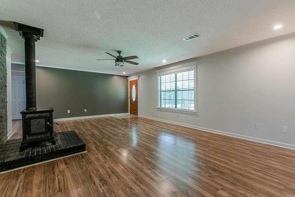 This charming 3-bedroom, 2-bathroom home is situated on 2.04 picturesque acres with mature trees, planter boxes, and room to roam. Step inside to find brand new luxury vinyl plank flooring throughout and an inviting living room complete with a cozy wood-burning stove. The spacious kitchen boasts updated stainless steel appliances, a stylish new backsplash, and both a refrigerator and beverage fridge that convey. The large bonus room offers endless possibilities--game room, second living area, or home theater--while the dedicated office provides the perfect space to work from home. Updated bathrooms and oversized closets in all bedrooms add both comfort and convenience. Outside, enjoy peaceful mornings on the beautiful covered front porch with a porch swing, plus take advantage of the RV cover and two outbuildings for all your storage needs. Washer and dryer convey! Don't miss your chance to own this versatile home in a serene setting. Some photos have been virtually staged. Agents See Remarks