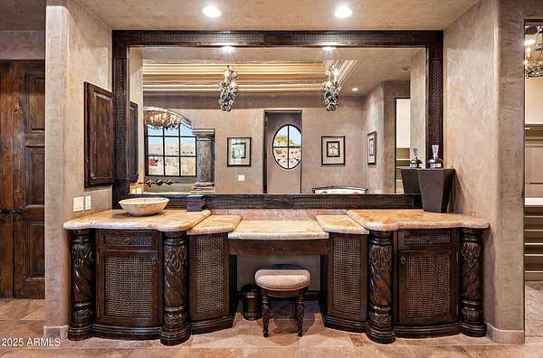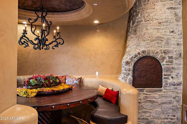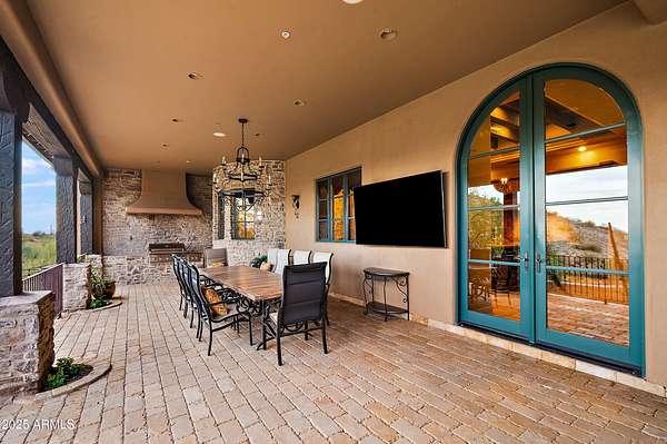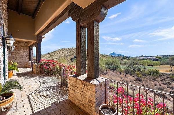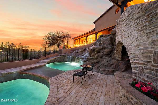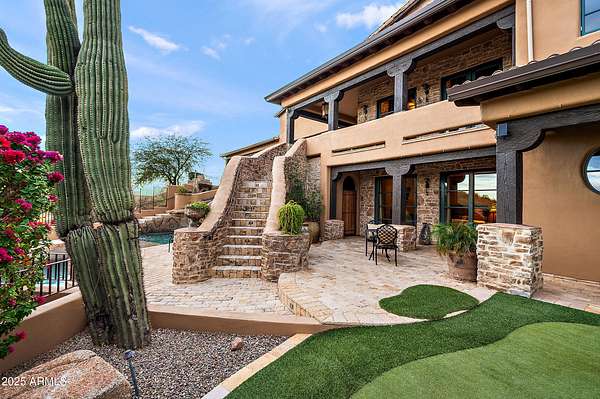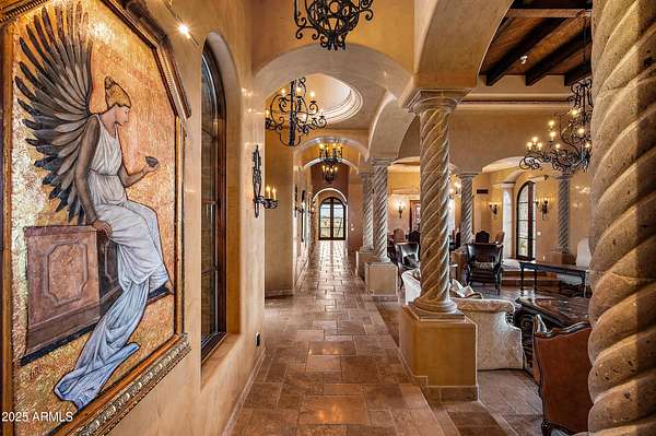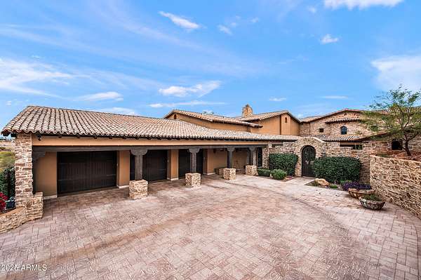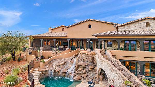 Embrace la dolce vita in this magnificent Tuscan estate, brimming with timeless Old World charm. Situated on a 1.79 ac lot the home is designed to capture views of Four Peaks, Red Mountain, and the Firerock Country Club golf course. A stretched paver driveway over a private bridge with whitewashed stone walls leads to a gated courtyard with bubbling fountains, fruit trees, and vibrant planters. Multiple sets of arched doors seamlessly connect the courtyard and terraces to the heart of the home, creating an effortless indoor/outdoor lifestyle. Inside bespoke architectural details include 18-20' dramatic dome and wood-beam ceilings, imported stone, hand-carved woods, 10' Cantera fireplace, and Venetian plaster walls. The home is one level with spacious 5 bedrooms/ensuites + seperate guest casita. Outdoor living is the showpiece with expansive terraces and a tiered pool featuring a two-story waterfall, stone slide, and plunge and play pool. Turnkey elegance awaits as furnishings are included. This extraordinary estate is one to be experienced in person to fully appreciate its artistry, scale, and one-of-a-kind details.