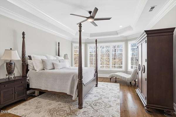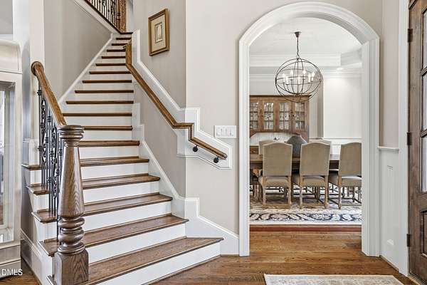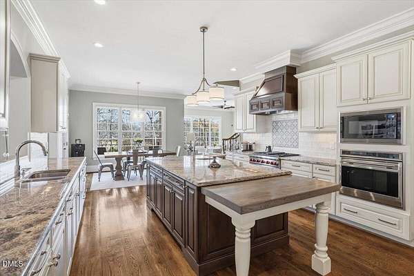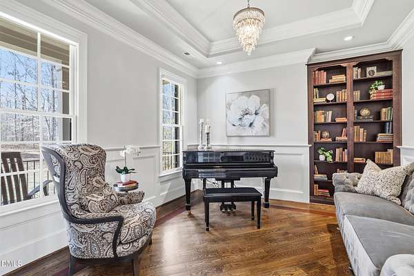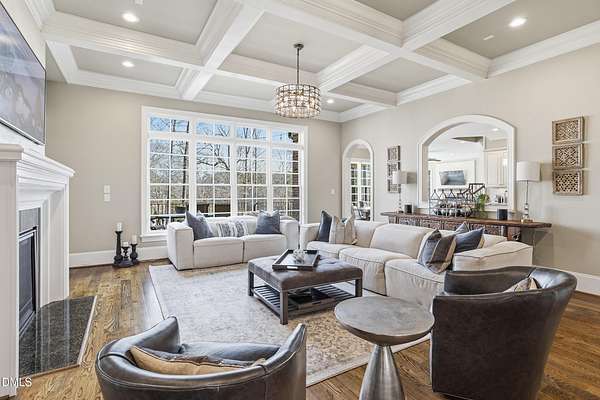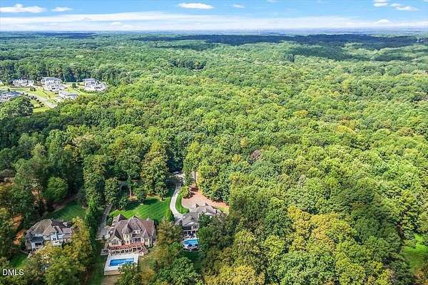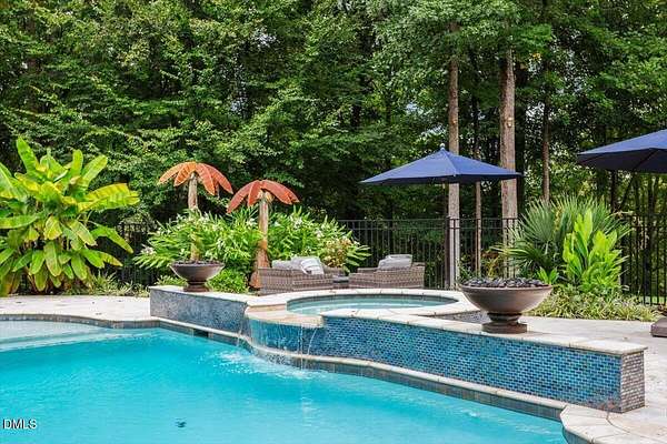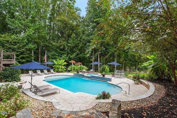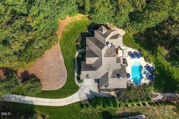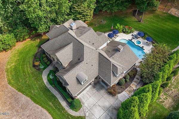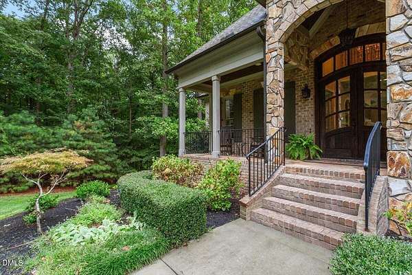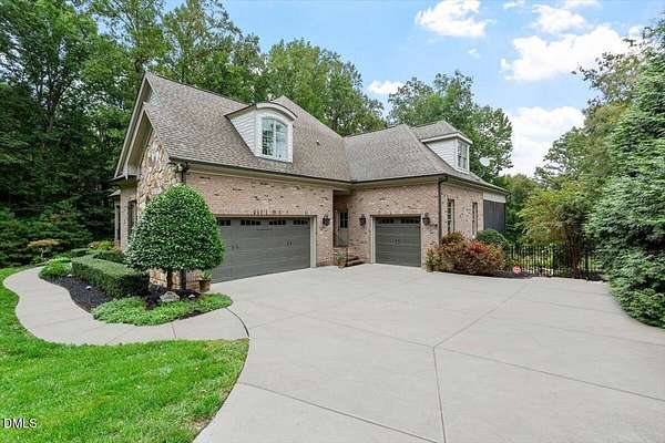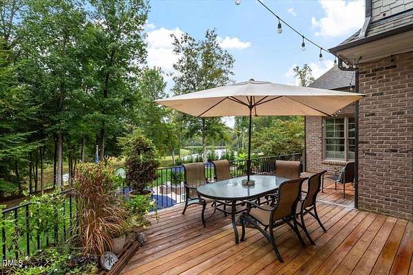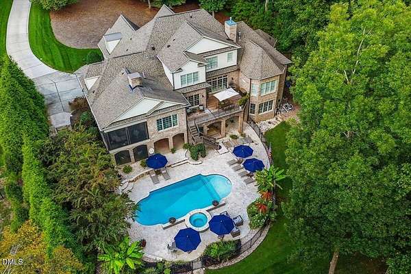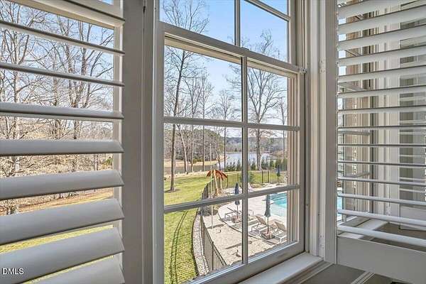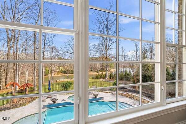 Rare opportunity to own an exceptional waterfront retreat in gated community. Surrounded by the natural beauty of water and woodlands, this remarkable lakefront estate, with a saltwater pool, offers privacy, craftsmanship, and an extraordinary lifestyle just moments from everyday conveniences. As you enter the home you will be captivated by the beautiful views that lie ahead. The dining room sets the tone with a graceful bay window, tray ceiling, and classic wainscoting, creating an inviting space for memorable gatherings. A butler's pantry seamlessly connects the dining room to the kitchen. French doors open to a private study with built-in bookcases. At the heart of the home, the family room blends architectural elegance and natural beauty. Twin bookcases frame the fireplace, while a coffered ceiling adds depth and character. Expansive windows capture breathtaking views of the lake and surrounding landscape. Open to the kitchen, the family room provides an inviting setting for everyday living and effortless entertaining. The well-appointed kitchen features a center island with seating, custom cabinetry, striking range hood, under-cabinet lighting, updated tile backsplash, and granite counters. Premium appliances include a Sub-Zero refrigerator, WOLF gas range, wall oven, and microwave. A walk-in pantry offers abundant storage and organization. The breakfast room is lined with a wall of windows, a scenic setting for casual dining. The sunroom provides sweeping views of the lake and pool, see-through fireplace, and access to the screened porch, a perfect retreat for indoor-outdoor living throughout the seasons. The serene 1st floor primary suite offers a stunning full-length bay window that captures peaceful views of the lake and woodlands. Two custom walk-in closets provide exceptional storage and organization. The primary bath creates a spa-like experiences with dual granite-topped vanities, oversized walk-in shower with 3 shower heads, relaxing soaking tub, and new vanity lights, chandelier and mirrors. The 2nd floor offers three generously-sized bedrooms. Two enjoy scenic views of the lake and pool and walk-in closets. All three bedrooms feature private ensuite baths. This level includes two large bonus rooms, back staircase and a walk-in attic. The lower level's open layout offers a wealth of living space, blending indoor comfort with resort-style enjoyment. A charming wine cellar and mini kitchen with bar seating create the perfect space for hosting. The game room accommodates a pool or ping-pong table, while the rec room features a gas fireplace framed by double bookcases. Completing the lower level, there is an exercise room, media room and a fifth bedroom providing a private retreat for guests, with a large walk-in closet, beautiful lake views and access to a full bath. Designed to embrace its lakeside setting, the home offers exceptional outdoor living spaces. A spacious deck is perfect for grilling and al fresco dining. The lower-level screened porch provides a cool, shaded retreat. The saltwater pool and spa with cascading waterfall create a true resort-style oasis. Expansive pool decking provides generous space for lounging and outdoor entertaining set against the home's breathtaking lakeside backdrop.Easy access to I-540 and RDU Airport