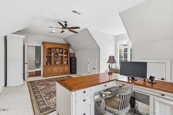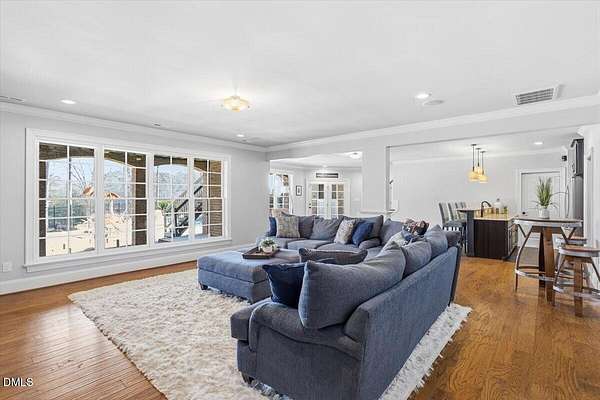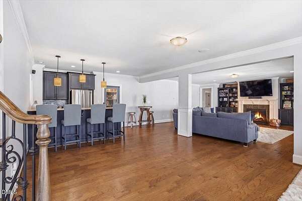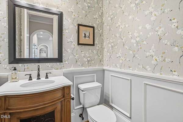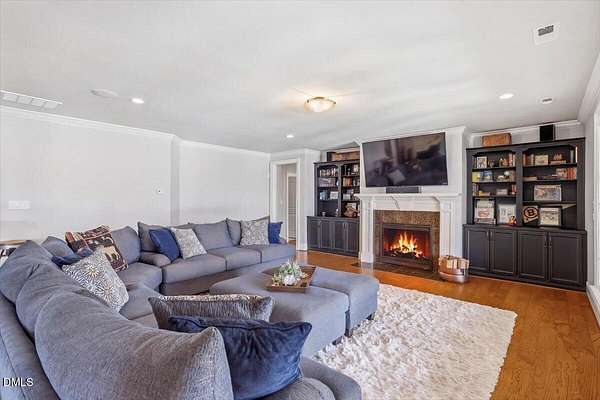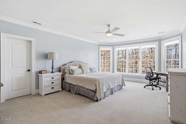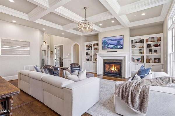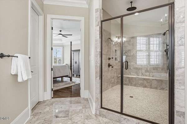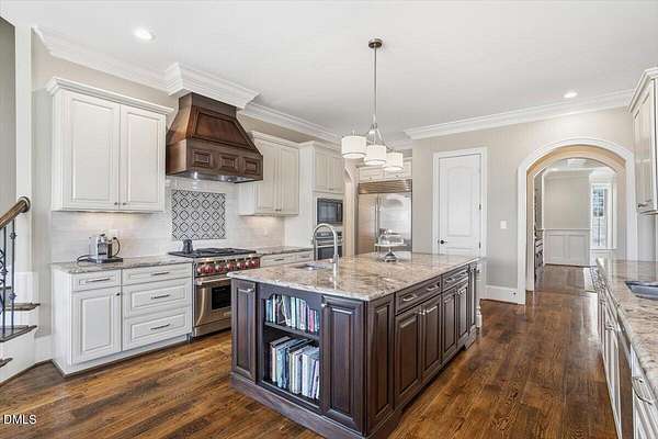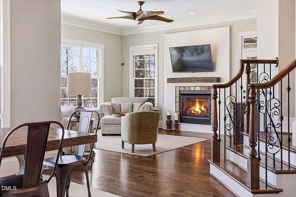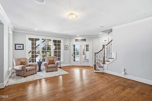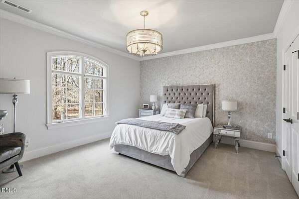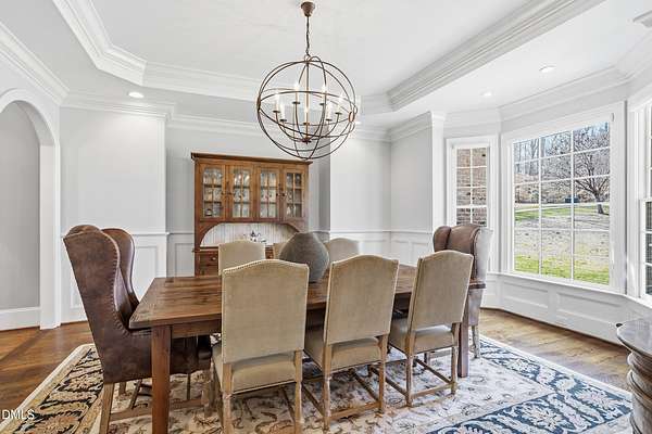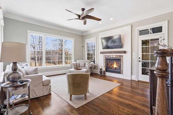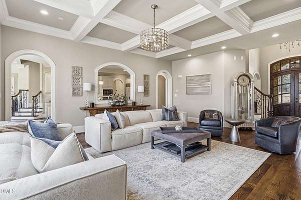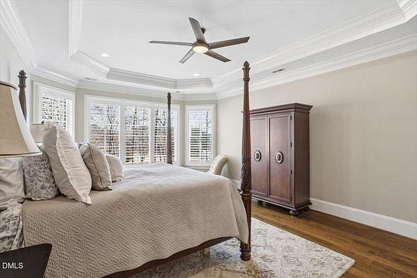 Rare opportunity to own an exceptional waterfront retreat in gated community. Surrounded by the natural beauty of water and woodlands, this remarkable lakefront estate, with a saltwater pool, offers privacy, craftsmanship, and an extraordinary lifestyle just moments from everyday conveniences. As you enter the home you will be captivated by the beautiful views that lie ahead. The dining room sets the tone with a graceful bay window, tray ceiling, and classic wainscoting, creating an inviting space for memorable gatherings. A butler's pantry seamlessly connects the dining room to the kitchen. French doors open to a private study with built-in bookcases. At the heart of the home, the family room blends architectural elegance and natural beauty. Twin bookcases frame the fireplace, while a coffered ceiling adds depth and character. Expansive windows capture breathtaking views of the lake and surrounding landscape. Open to the kitchen, the family room provides an inviting setting for everyday living and effortless entertaining. The well-appointed kitchen features a center island with seating, custom cabinetry, striking range hood, under-cabinet lighting, updated tile backsplash, and granite counters. Premium appliances include a Sub-Zero refrigerator, WOLF gas range, wall oven, and microwave. A walk-in pantry offers abundant storage and organization. The breakfast room is lined with a wall of windows, a scenic setting for casual dining. The sunroom provides sweeping views of the lake and pool, see-through fireplace, and access to the screened porch, a perfect retreat for indoor-outdoor living throughout the seasons. The serene 1st floor primary suite offers a stunning full-length bay window that captures peaceful views of the lake and woodlands. Two custom walk-in closets provide exceptional storage and organization. The primary bath creates a spa-like experiences with dual granite-topped vanities, oversized walk-in shower with 3 shower heads, relaxing soaking tub, and new vanity lights, chandelier and mirrors. The 2nd floor offers three generously-sized bedrooms. Two enjoy scenic views of the lake and pool and walk-in closets. All three bedrooms feature private ensuite baths. This level includes two large bonus rooms, back staircase and a walk-in attic. The lower level's open layout offers a wealth of living space, blending indoor comfort with resort-style enjoyment. A charming wine cellar and mini kitchen with bar seating create the perfect space for hosting. The game room accommodates a pool or ping-pong table, while the rec room features a gas fireplace framed by double bookcases. Completing the lower level, there is an exercise room, media room and a fifth bedroom providing a private retreat for guests, with a large walk-in closet, beautiful lake views and access to a full bath. Designed to embrace its lakeside setting, the home offers exceptional outdoor living spaces. A spacious deck is perfect for grilling and al fresco dining. The lower-level screened porch provides a cool, shaded retreat. The saltwater pool and spa with cascading waterfall create a true resort-style oasis. Expansive pool decking provides generous space for lounging and outdoor entertaining set against the home's breathtaking lakeside backdrop.Easy access to I-540 and RDU Airport