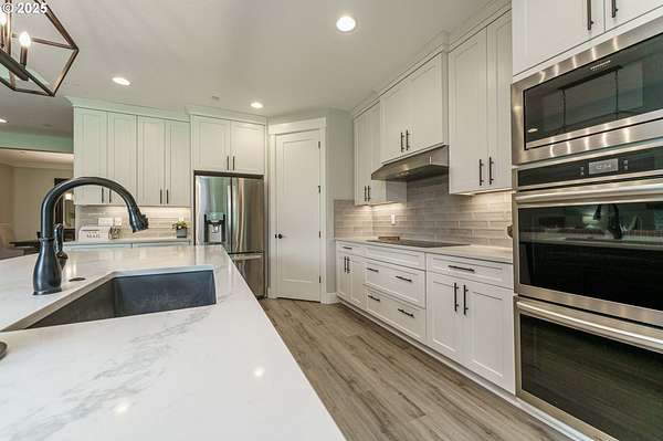 - Builtin Oven, Convection Oven, Cooktop, Dishwasher, Disposal, Double Oven, ENERGYSTAR Qualified Appliances, Induction Cooktop, Island, Microwave, Pantry, Plumbed For Ice Maker, Quartz, Range Hood, Solid Surface Countertop, Stainless Steel Appliance