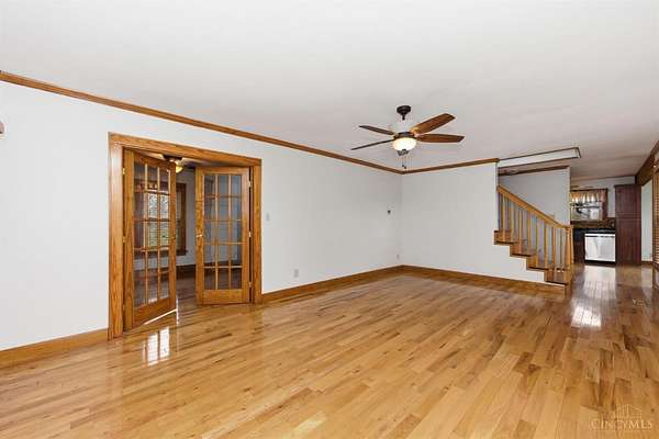 - Beam Ceiling, Cathedral Ceiling, Crown Molding, French Doors, Multi Panel Doors, Natural Woodwork