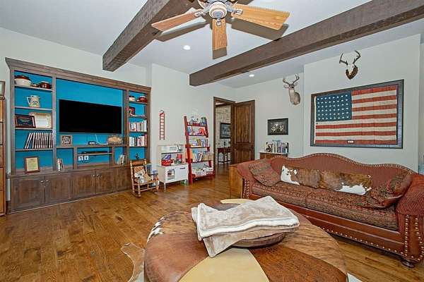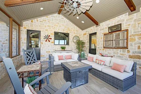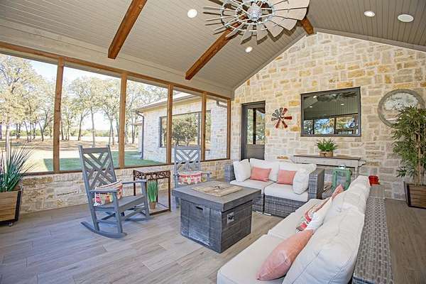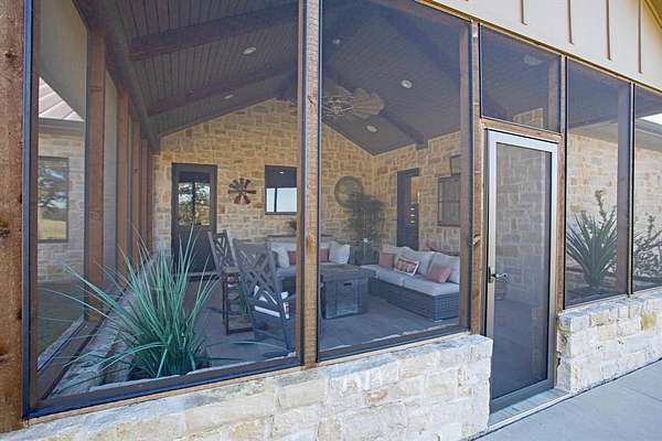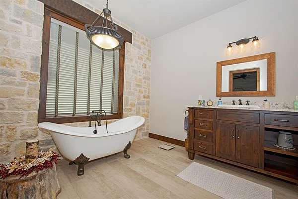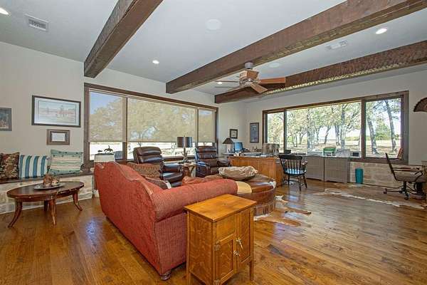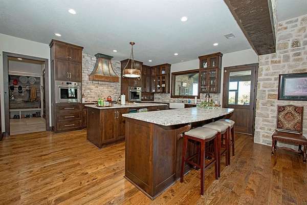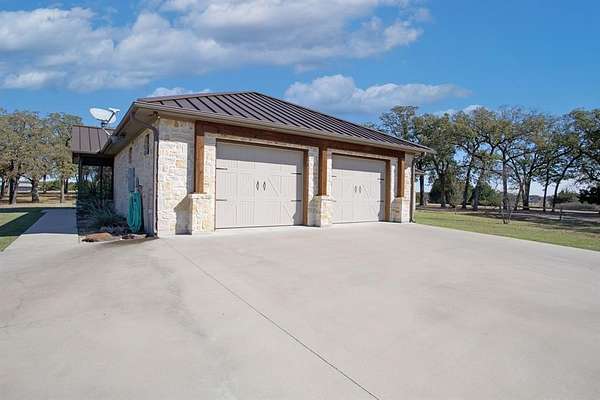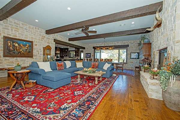 OUTSTANDING AUSTIN STONE RANCH SITUATED ON 30 ACRES SURROUNDED BY MAGNIFICENT OAK TREES AND LIFE TIME METAL ROOF. STONE INTERIOR BRINGS THE BEAUTY TO LIFE WITH HAND SCRAPED WOOD FLOORS,WALL OF WINDOWS DESIGNED TO WATCH THE WILD LIFE AND ENJOY THE SERINITY. OPEN LIVING WITH WOOD BEAMS OPENING TO THE CHEFS KITCHEN, COPPER VENT A HOOD, 6 BURNER COMMERCIAL GRADE GAS STOVE, DOUBLE OVENS, WINE COOLER, BUILT IN REFRIGERATOR, MICROWAVE, DISHWASHER, OVERSIZED GRANITE ISLAND. COMBINATION LAUNDRY AND MUD ROOM CAN ENTER FROM GARAGE WITH CONCRETE SAFE ROOM AND HALF BATH.OVERSIZED GARAGE WITH STORAGE. LARGE 2 SECONDARY BATHS WITH ENSUITES, WALK IN CLOSETS, PREMIUM MAIN BEDROOM,SPLIT FROM SECONDARY BEDROOMS, DOUBLE VANITIES,CLAW FOOT TUB,SEPARATE SHOWER.BRING THE LIVESTOCK FENCED AND CROSSED FENCED AND EXCEPTIONAL 1800 SF BARN. SCREENED IN PORCH OFF THE MAIN LIVING AREAS.