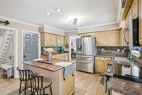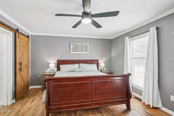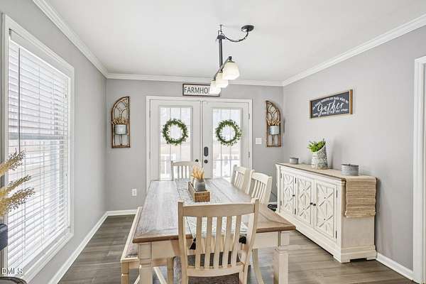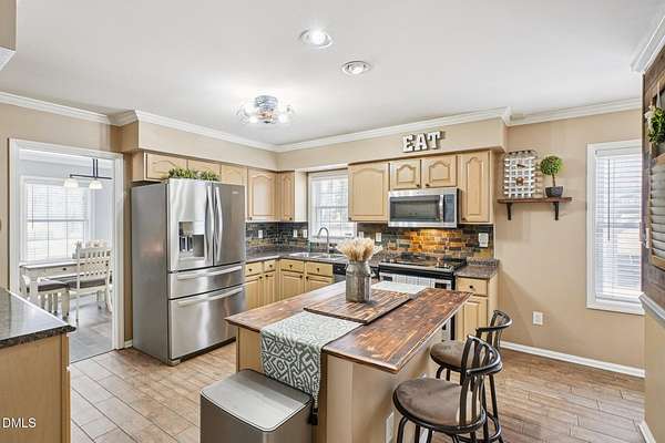 This inviting two-story home offers a thoughtful layout with three bedrooms and two and a half bathrooms, plus a separate detached shop with heating and air conditioning and a finished bonus room, ideal for a home office, workshop, or hobby space. The main level features a spacious primary suite with a walk-in closet and walk-in shower, providing comfort and privacy. Hardwood, laminate, and tile flooring add style and durability throughout. The kitchen is well-appointed with stainless steel appliances, a tile backsplash, pantry, and a central island that opens to the living areas, while a separate dining room and elegant crown molding enhance the home's character. Upstairs, you'll find the additional bedrooms and a full bath. Outdoor living is a highlight with a welcoming front stoop, a rear deck, and a rear patio complete with a mounted pavilion-perfect for entertaining or relaxing. Conveniently located near Durham, Roxboro, and Burlington, with a short drive to Danville, this property offers both comfort and accessibility.