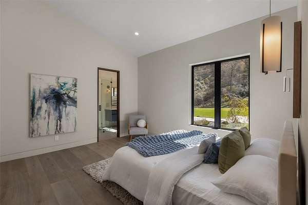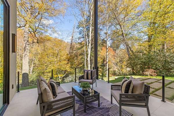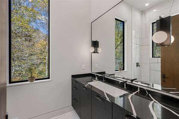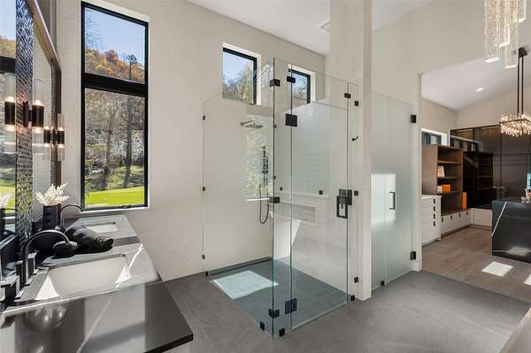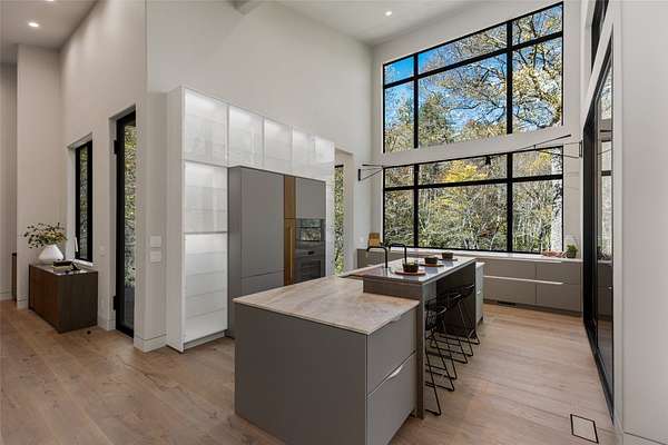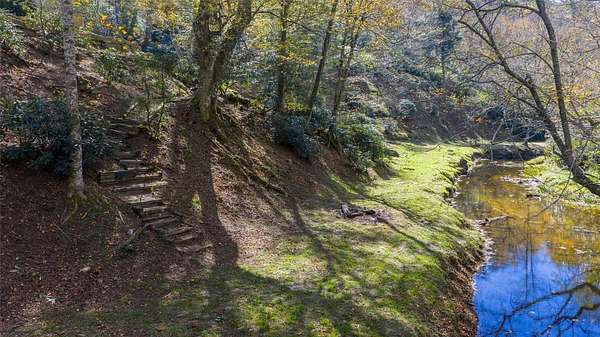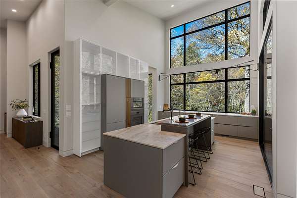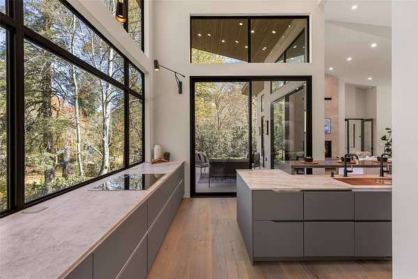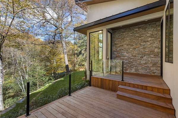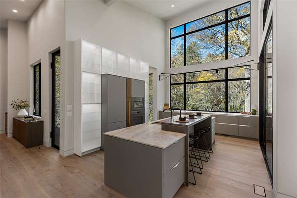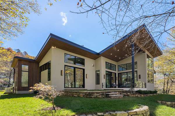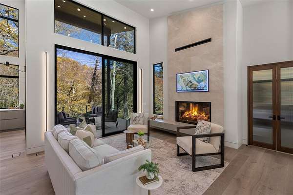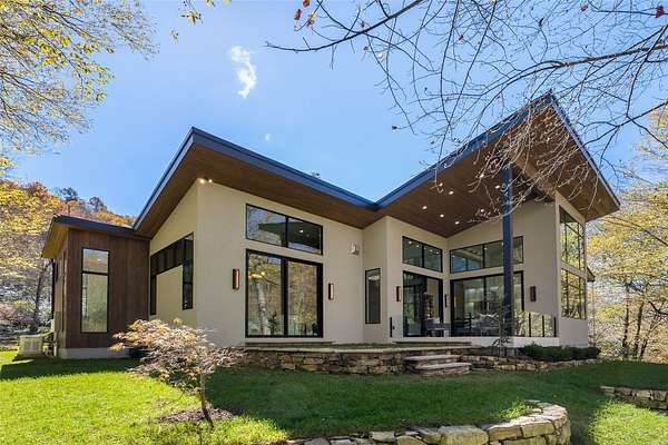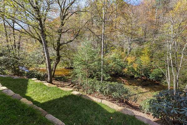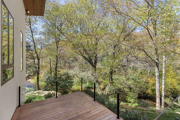 This newly constructed home redefines luxury mountain living. Blending modern and contemporary architecture with organic materials, it features soaring 25-foot ceilings, floor-to-ceiling glass framing views of the Cullasaja River, and seamless indoor-outdoor flow. The gourmet kitchen showcases Miele appliances, quartzite countertops, and dual entertaining decks, one overlooking the river and another where the soft sound and partial view of a neighboring waterfall enhances every gathering. The primary suite is a private retreat with a custom walnut fireplace wall, spa-inspired bath, and terrace that opens to nature. A hidden powder room adds an unexpected, design-forward touch, while a climate-controlled glass wine gallery lined with backlit marble serves as a functional work of art. Two guest suites and a sophisticated interplay of textures and finishes complete the home. Perfectly positioned just minutes from the great outdoors and convenient to restaurants, boutiques, art and all that downtown Highlands and nearby Cashiers have to offer.