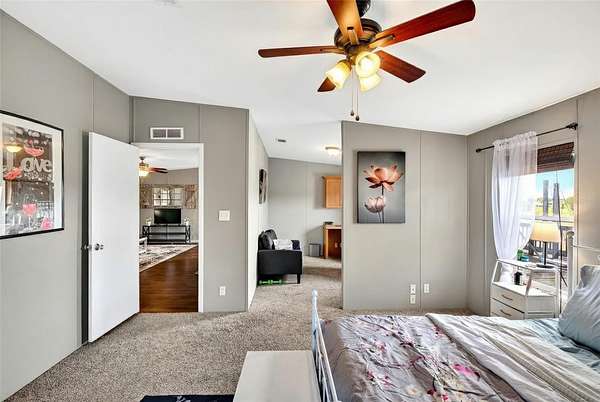 - Ceiling Fans(s), Eat-In Kitchen, High Ceilings, Living Room/Dining Room Combo, Open Floorplan, Split Bedroom, Stone Counters, Thermostat, Vaulted Ceiling(s), Walk-In Closet(s), Window Treatments