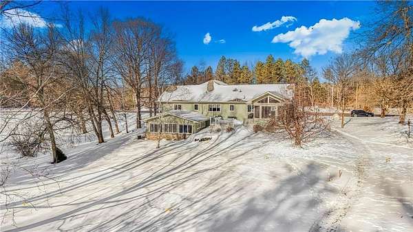 One-owner home where pride of ownership is evident at every turn. This meticulously maintained walk-out rambler is spotless, thoughtfully designed, and perfectly positioned to take in the serene backyard views. The kitchen features wrap-around cabinetry and Cambria countertops and flows seamlessly into the dining area and three-season porch as an ideal spot to enjoy summer mornings with coffee while overlooking the beautifully landscaped yard. The spacious living room offers a large bay window and cozy fireplace, creating a warm and inviting space to gather. Three bedrooms on one level include a private primary suite with its own bath. The walk-out lower level offers exceptional flexibility and comfort, featuring a second kitchen, living room with fireplace, office, generous storage, and a spacious laundry room (washer and dryer just 2 years old). Step into the four-season porch and enjoy year-round relaxation, with direct access to the backyard perfect for quiet evenings, entertaining, or simply taking in the peaceful setting. Outside, the deck provides the ideal place for grilling, gathering with friends, or unwinding at the end of the day. Recent updates include a furnace (5 years), roof (3 years), water heater (2 years), and durable steel siding. The 2.5-acre yard is truly a showstopper with impeccable landscaping, an irrigation system, four apple trees, and a nicely wooded backdrop offering privacy and natural beauty. An additional 26x32 garage with steel roof, water, and electric is perfect for hobbies and storage. Seller will have the septic system replaced in the spring(design already complete) Enjoy peaceful country living with space to breathe, yet just minutes from local lakes, restaurants, and everyday conveniences. This home has been deeply loved and is ready for new owners to create their own memories here.
