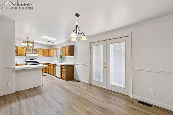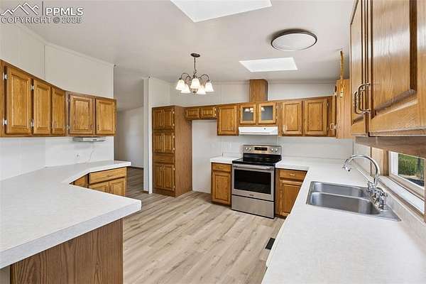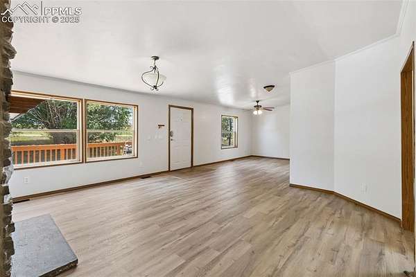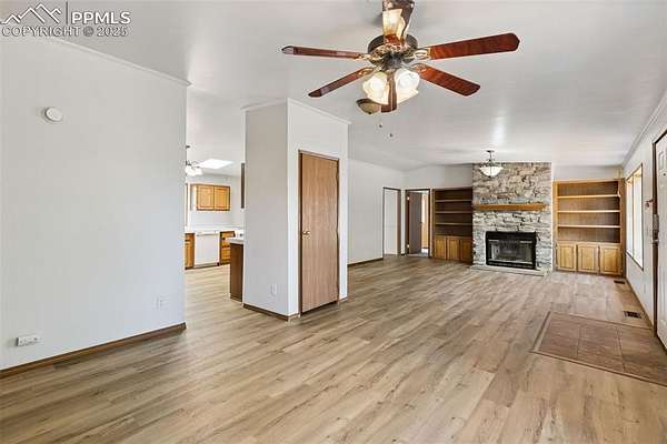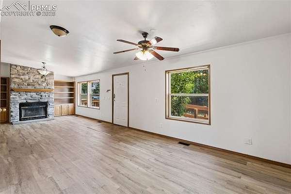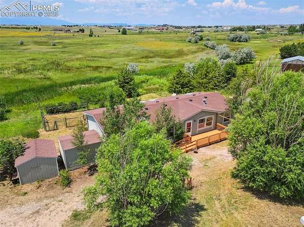 Discover the perfect blend of comfort and country living in this well-maintained, beautifully decorated one-level home nestled on spacious acreage in peaceful Peyton, CO. Enjoy wide-open prairie views and breathtaking sights of Pikes Peak-right from your own backyard. Inside, the open-concept layout boasts vaulted ceilings, a cozy wood-burning fireplace with stone surround and wood mantle, and built-in bookshelves-ideal for both relaxation and entertaining. The kitchen and dining areas flow together seamlessly, featuring a functional layout with a breakfast bar, pantry, and oak cabinetry. The entire home is enhanced with brand new luxury vinyl plank (LVP) flooring throughout, with fresh carpet in all bedrooms for added comfort. The spacious primary suite includes a lighted ceiling fan and a private 5-piece bath. A second full bathroom provides convenience for family or guests. Enjoy outdoor living on the deck overlooking the fenced backyard-perfect for pets, play, or gatherings. Three sheds and a tack barn offer ample storage and space for horses or hobbies. Recent updates and features include: New furnace A/C recently serviced New water heater and PEX plumbing installed throughout. Brand new LVP flooring throughout the main living areas New carpet in bedrooms Skylights and ceiling fans for great natural light and airflow Freshly painted front and back decks Don't miss this move-in ready gem offering room to roam, peaceful surroundings, and true Colorado charm.