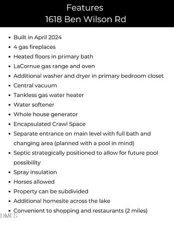 1618 Ben Wilson Road isn't just a home... it's a lifestyle. Tucked away in the peaceful countryside of Mebane, this exceptional property offers the perfect blend of privacy, space, and charm--yet is conveniently located just 2 miles from restaurants, shopping, and the outlets. Set on over 16 acres with a stunning 8-acre lake, the setting is nothing short of breathtaking--ideal for those seeking tranquility, recreation, or the opportunity to create something even more expansive. Whether it's morning coffee as the sun rises... or evenings watching it set... this is where life slows down in all the right ways. Built in 2024, this thoughtfully designed home blends modern luxury with timeless comfort. The main level features three bedrooms, including a stunning primary suite complete with heated floors in the spa-like bath and ensuite laundry conveniently located within the primary closet. The heart of the home is a bright and open chef's kitchen, featuring a LaCornue gas range and oven, and seamlessly flowing through sliding doors to a large patio with a fireplace overlooking the lake--creating the perfect setting for indoor-outdoor living and entertaining. With four fireplaces throughout, warmth and ambiance are felt in every season. Upstairs, you'll find two additional bedrooms and a versatile flex space, offering room to grow, work, or host. A unique design feature includes two separate staircases--one leading to the main upper level, and another guiding you to a private, secluded bonus room, ideal for a home office, studio, or guest retreat. Designed with future possibilities in mind, the home was positioned to accommodate a pool with ease. Additional features include a whole-house generator, water softener system, and encapsulated crawlspace for added efficiency and peace of mind. Outdoors, the possibilities are endless. Horses are allowed, and with an additional homesite located across the lake, the property offers incredible flexibility. Potential subdivision opportunities make this a rare investment as well as a personal retreat. A property like this doesn't come along often--where natural beauty, thoughtful design, and lifestyle come together in one extraordinary offering.