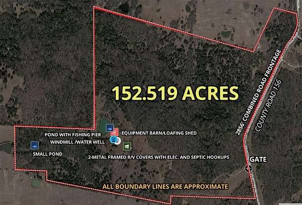 152.519-acre tract located NW of Whitesboro with an agricultural exemption. This property has lots of character with rolling hills, creek, woods, open pasture areas, two ponds, fully fenced, two covered RV structures complete with electric, water and septic hookups, a windmill, water meter already installed at the road, and a barn. There is abundant wildlife in this area. Several good areas to choose from for build sites for your dream home. This tract has approximately 2860 FEET of road frontage! It's a blank canvas with the basic infrastructure in place. Too many possibilities! With the expansion of the North Dallas Tollway to Tioga this wonderful property is only approximately one hour drive from the intersection of 380 and the DNT to a peaceful and quiet getaway. Great property for your dream ranch home build or a recreational site to get out of the city to play or hunt on. Take a look for yourself before it's gone!