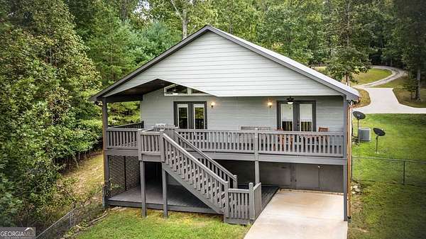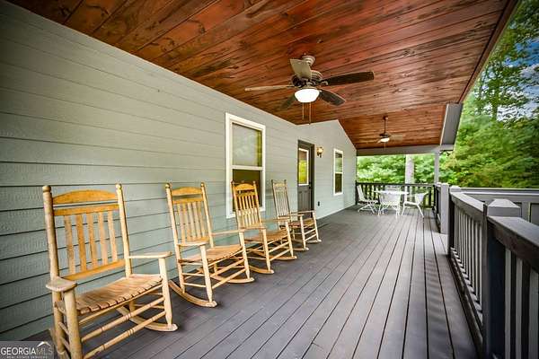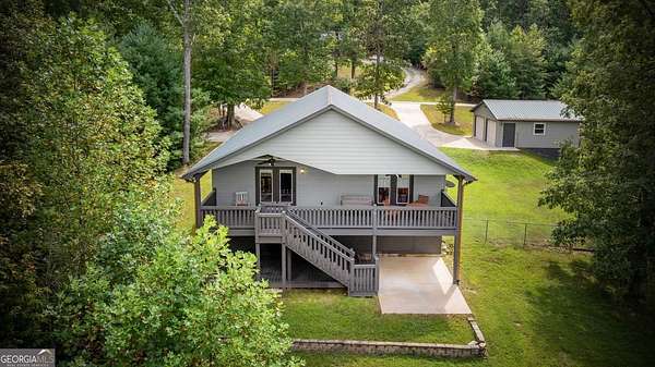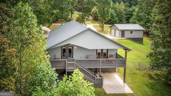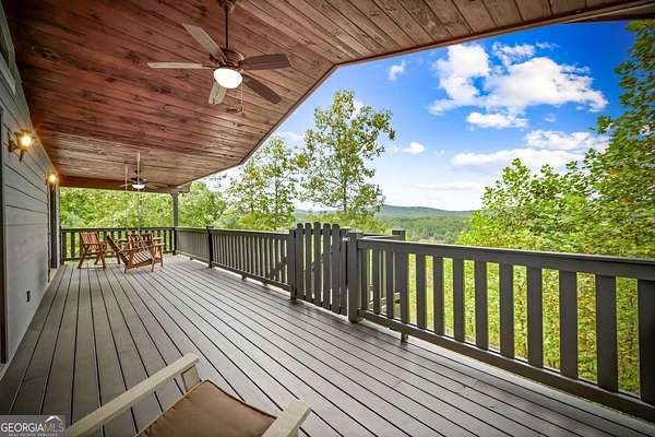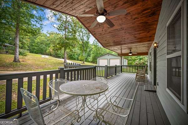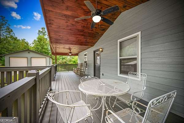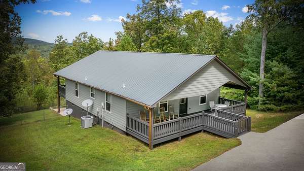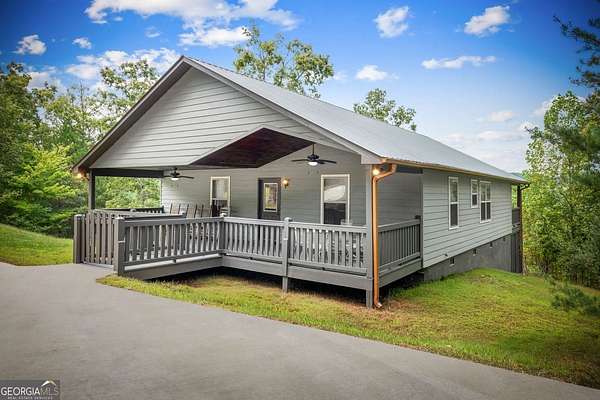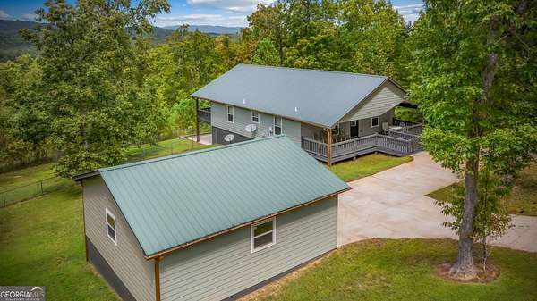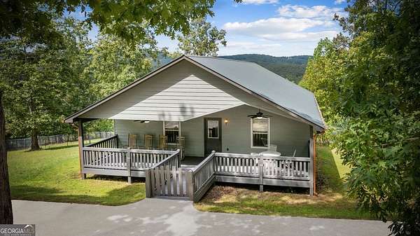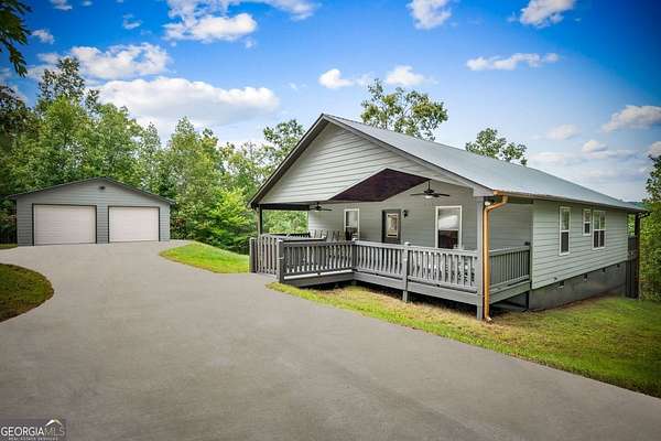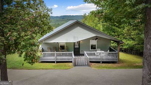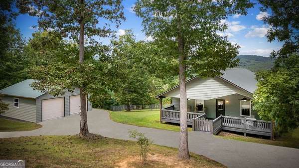 Discover your own slice of mountain paradise in this charming 3-bedroom, 2-bath cabin-style home, perfectly situated on 1.8 serene acres with sweeping long-range mountain views. Offering 1,591 square feet of comfortable living space, this single-level ranch home blends rustic warmth with modern conveniences. Step inside to an inviting open floor plan filled with natural light streaming through large windows. Gorgeous wood floors flow throughout, complementing the soaring ceilings in the great room. The kitchen is a chef's delight, featuring granite countertops, a spacious island, stainless steel appliances, pantry area and an adjoining breakfast area ideal for casual meals or entertaining. The oversized primary suite boasts a walk-in closet and a large bath, while two additional bedrooms and a second full bath provide space for family or guests. Both bathrooms are generously sized, offering comfort and functionality. Outdoor living is equally impressive: relax on the expansive front porch in a rocking chair with your morning coffee, unwind on the back deck while soaking in the expansive mountain views, or enjoy the level, fenced backyard-perfect for pets or gardening. The detached two-car garage offers ample parking and storage, and there's plenty of extra space for visitors or recreational vehicles. Recent updates include new low-maintenance HardiPlank siding, copper gutters with guards, and fresh exterior paint on both the home and garage, ensuring years of worry-free living. With no HOA, tons of privacy, and close proximity to downtown Blue Ridge, Blairsville, and Lake Nottely, hiking, fishing, camping, kayaking and national forest this property is the perfect blend of tranquility and convenience. Whether you're looking for a full-time residence, vacation getaway, or short-term rental opportunity, this mountain retreat is ready to welcome you home. Riding mower, push mower, washing machine & dryer to convey with the home.