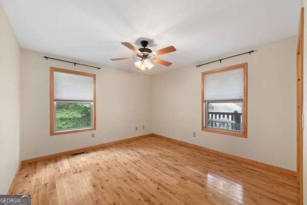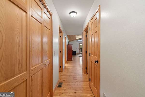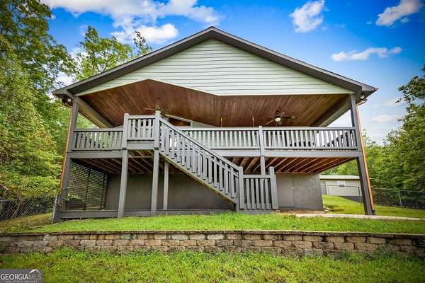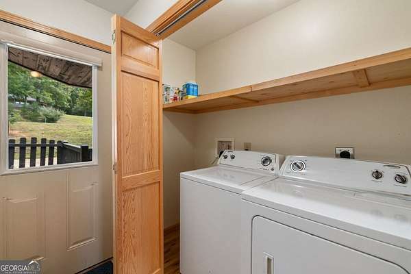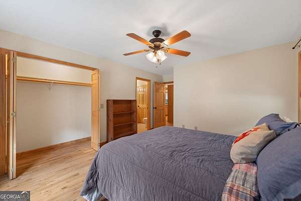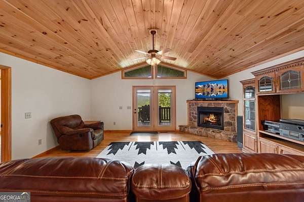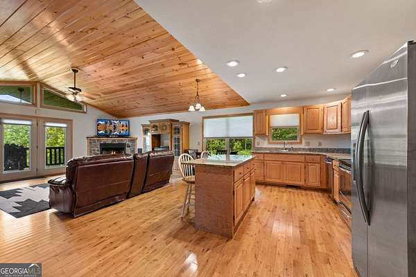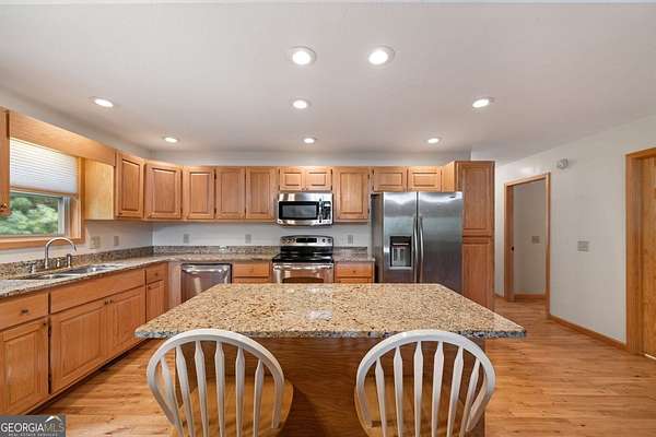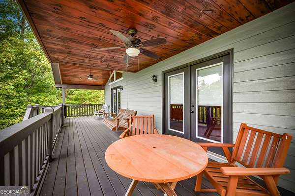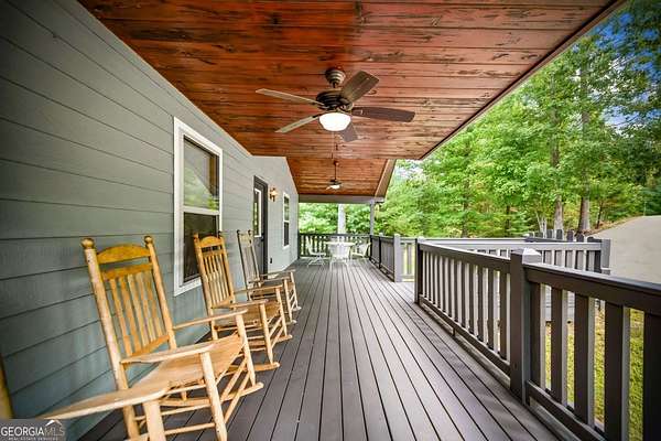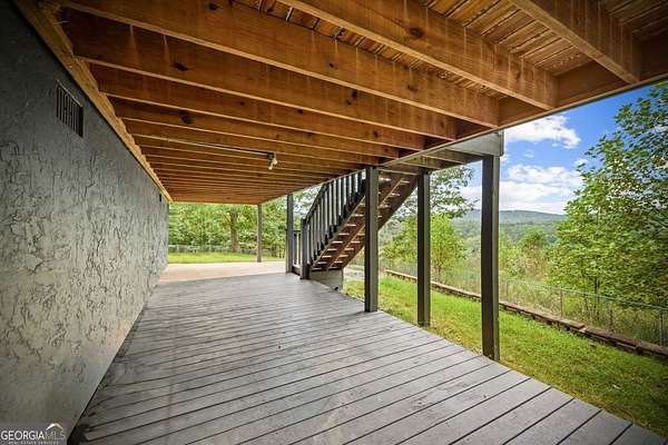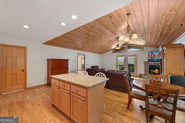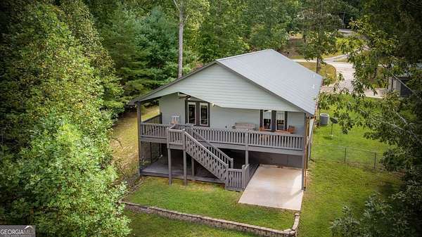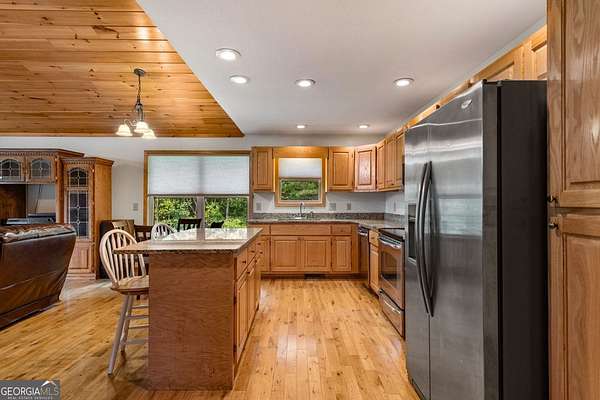 Discover your own slice of mountain paradise in this charming 3-bedroom, 2-bath cabin-style home, perfectly situated on 1.8 serene acres with sweeping long-range mountain views. Offering 1,591 square feet of comfortable living space, this single-level ranch home blends rustic warmth with modern conveniences. Step inside to an inviting open floor plan filled with natural light streaming through large windows. Gorgeous wood floors flow throughout, complementing the soaring ceilings in the great room. The kitchen is a chef's delight, featuring granite countertops, a spacious island, stainless steel appliances, pantry area and an adjoining breakfast area ideal for casual meals or entertaining. The oversized primary suite boasts a walk-in closet and a large bath, while two additional bedrooms and a second full bath provide space for family or guests. Both bathrooms are generously sized, offering comfort and functionality. Outdoor living is equally impressive: relax on the expansive front porch in a rocking chair with your morning coffee, unwind on the back deck while soaking in the expansive mountain views, or enjoy the level, fenced backyard-perfect for pets or gardening. The detached two-car garage offers ample parking and storage, and there's plenty of extra space for visitors or recreational vehicles. Recent updates include new low-maintenance HardiPlank siding, copper gutters with guards, and fresh exterior paint on both the home and garage, ensuring years of worry-free living. With no HOA, tons of privacy, and close proximity to downtown Blue Ridge, Blairsville, and Lake Nottely, hiking, fishing, camping, kayaking and national forest this property is the perfect blend of tranquility and convenience. Whether you're looking for a full-time residence, vacation getaway, or short-term rental opportunity, this mountain retreat is ready to welcome you home. Riding mower, push mower, washing machine & dryer to convey with the home.