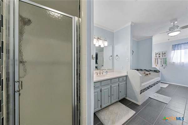 - Beamed Ceilings, Bookcases, Breakfast Area, Breakfast Bar, Ceiling Fans, Dining Area, Double Vanity, Eat In Kitchen, High Ceilings, Jetted Tub, Kitchen Dining Combo, Multiple Dining Areas, Recessed Lighting, Separate Formal Dining Room, Separate Shower, Vanity